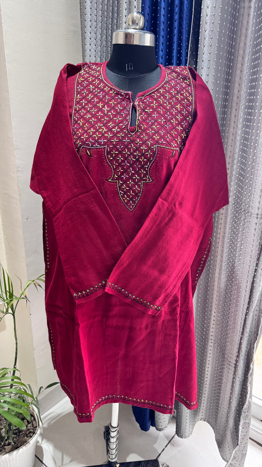 Maroon Sozni Hand Embroidered Pure Marino Wool Kashmiri Pheran with Pockets and Hand Embroidered Sleeves (Size 56”)
