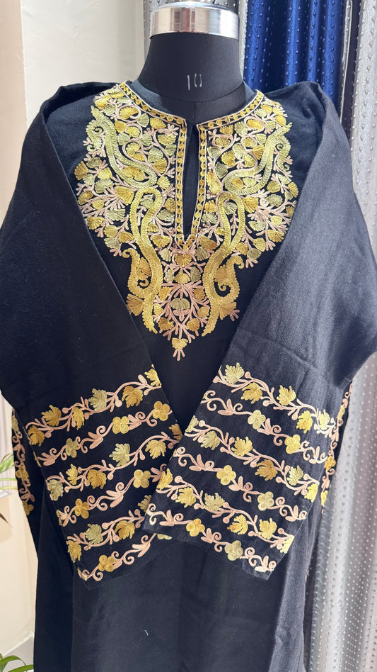 Alluring Black Hand Embroidered Pure Marino Wool Kashmiri Pheran with Pockets and Hand Embroidered Sleeves (Size 56”)