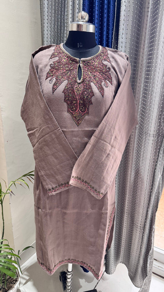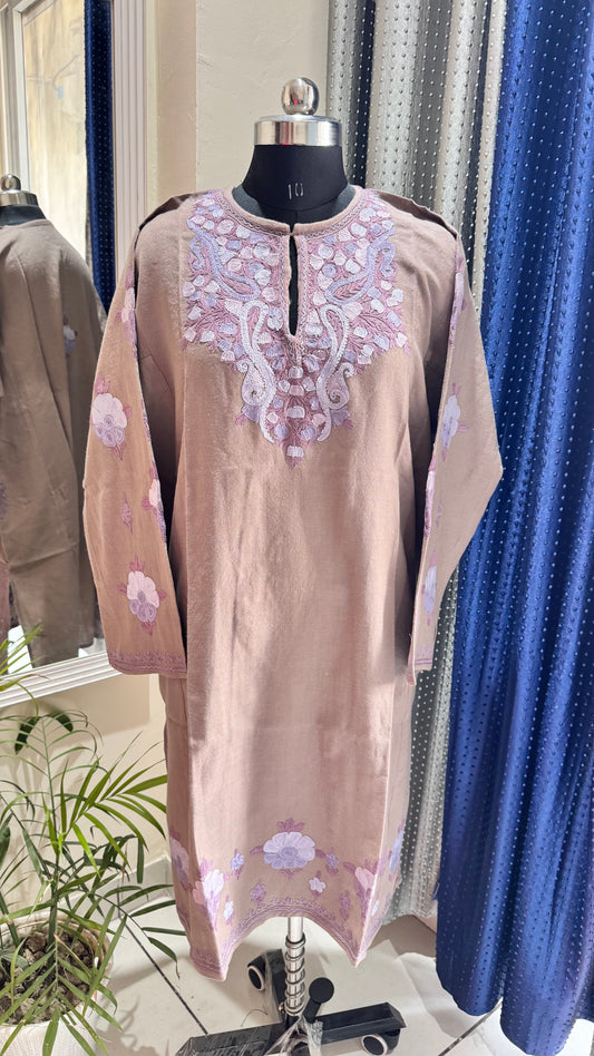 Pashmina Shade Hand Embroidered Pure Marino Wool Kashmiri Pheran with Pockets and Hand Embroidered Sleeves (Size 54”)