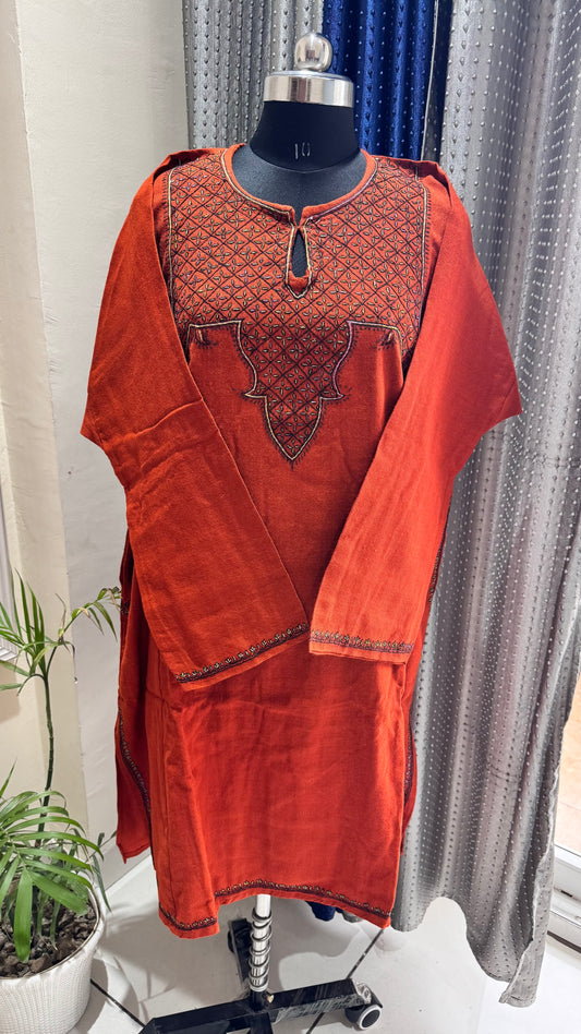 Burnt Orange Hand Embroidered Pure Marino Wool Kashmiri Pheran with Pockets and Hand Embroidered Sleeves (Size 58”)