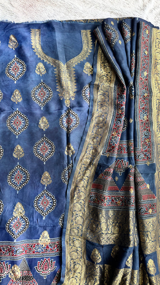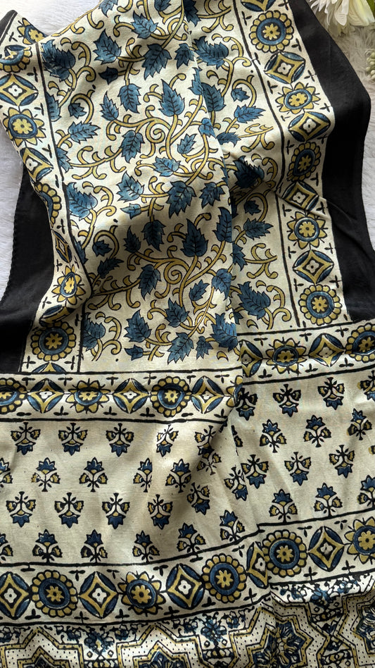 Black Shade Blue Leaf Motif Ajrakh Hand Block Print Mashru Silk Stole with Tassels