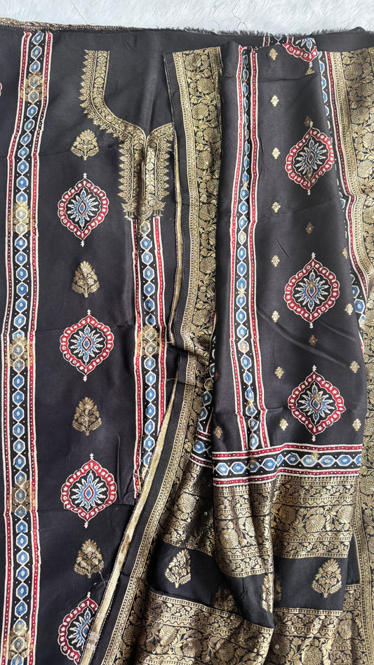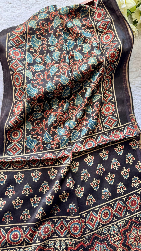 Black Shade Flower Motif Ajrakh Hand Block Print Mashru Silk Stole with Tassels