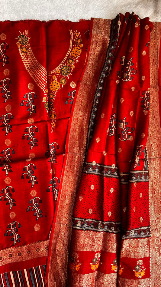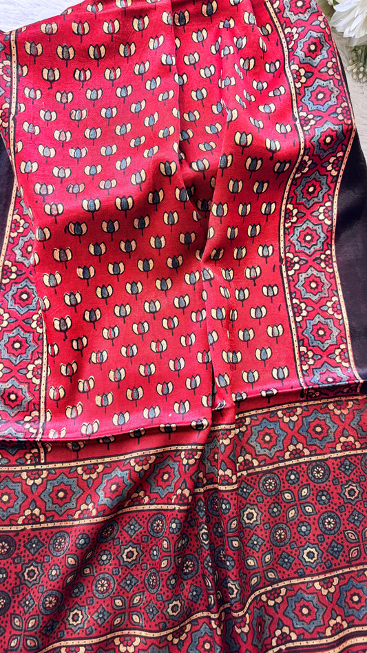 Red Shade Flower Motif Ajrakh Hand Block Print Mashru Silk Stole with Tassels