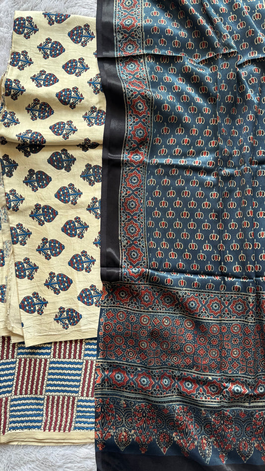 Offwhite Flower Motif Mashru 3 pc Suit Set with Ajrakh Mashru Tasseled Silk Stole