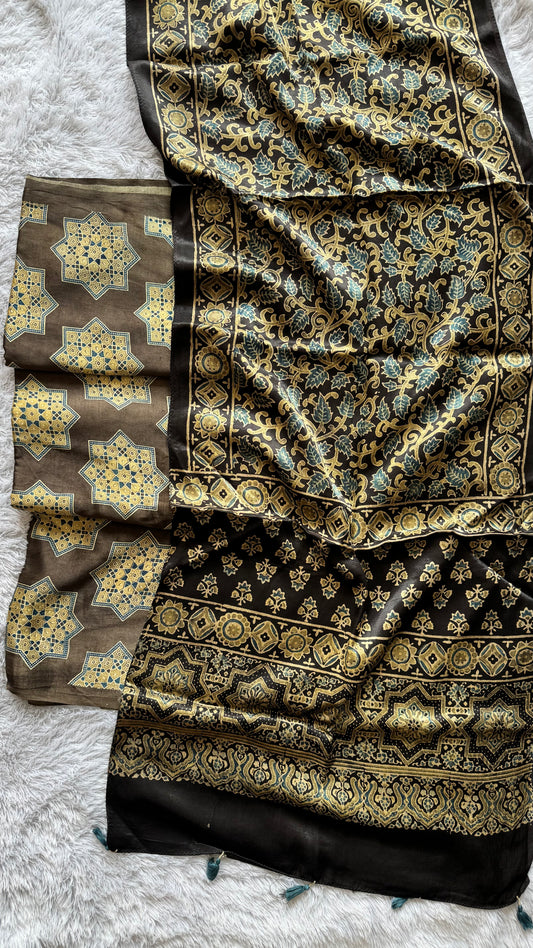 Coffee Brown Symmetrical Flower Motif Mashru Kurta fabric with Ajrakh Mashru Tasseled Silk Stole