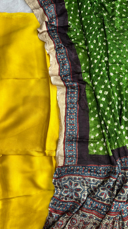 Solid Yellow Modal Silk 2pc Suit Material with Green Bandhani Ajrakh Modal Silk Dupatta