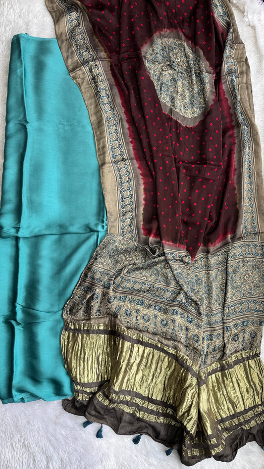 Aqua Blue Solid Shade Modal Silk 2pc Suit Material with Maroon Bandhani Ajrakh Modal Silk Dupatta