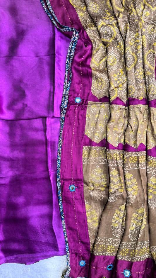 Margenta Solid Shade Modal Silk 2pc Suit Material with Golden Ajrakh Modal Silk Dupatta