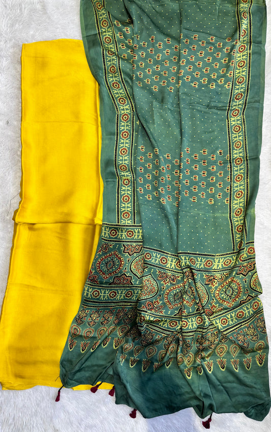 Yellow Solid Shade Modal Silk 2pc Suit Material with Green Ajrakh Kamal Buta Modal Silk Dupatta