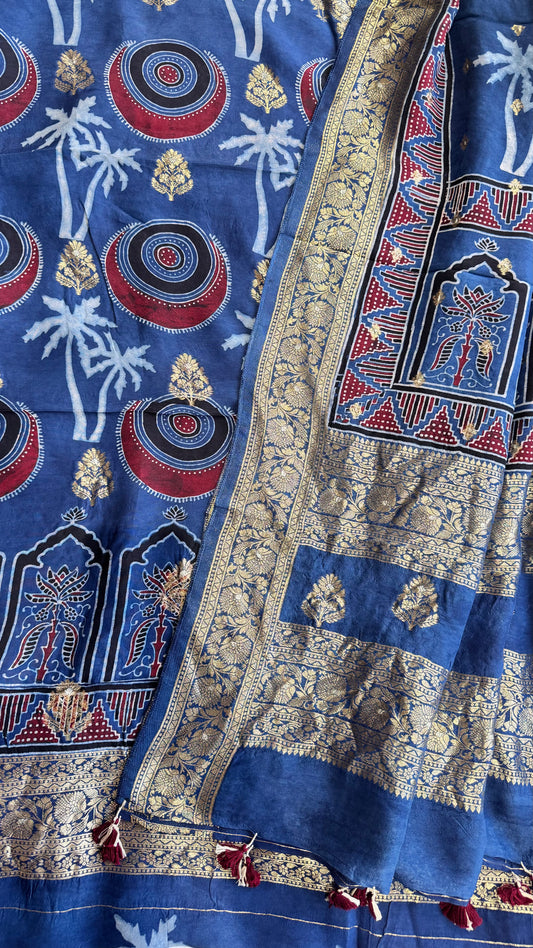 Blue Palm Circle Motif Pure Dola Silk Ajrakh Hand Block Print 2pc Suit Material Set with Zari Yoke and Nakkashi Dupatta