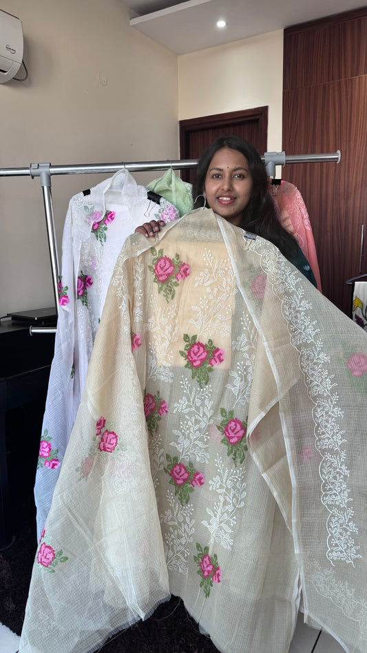 Offwhite Kota-Doria 3 Piece Suit Set with Chikankari Embroidery and Kota Doria Dupatta