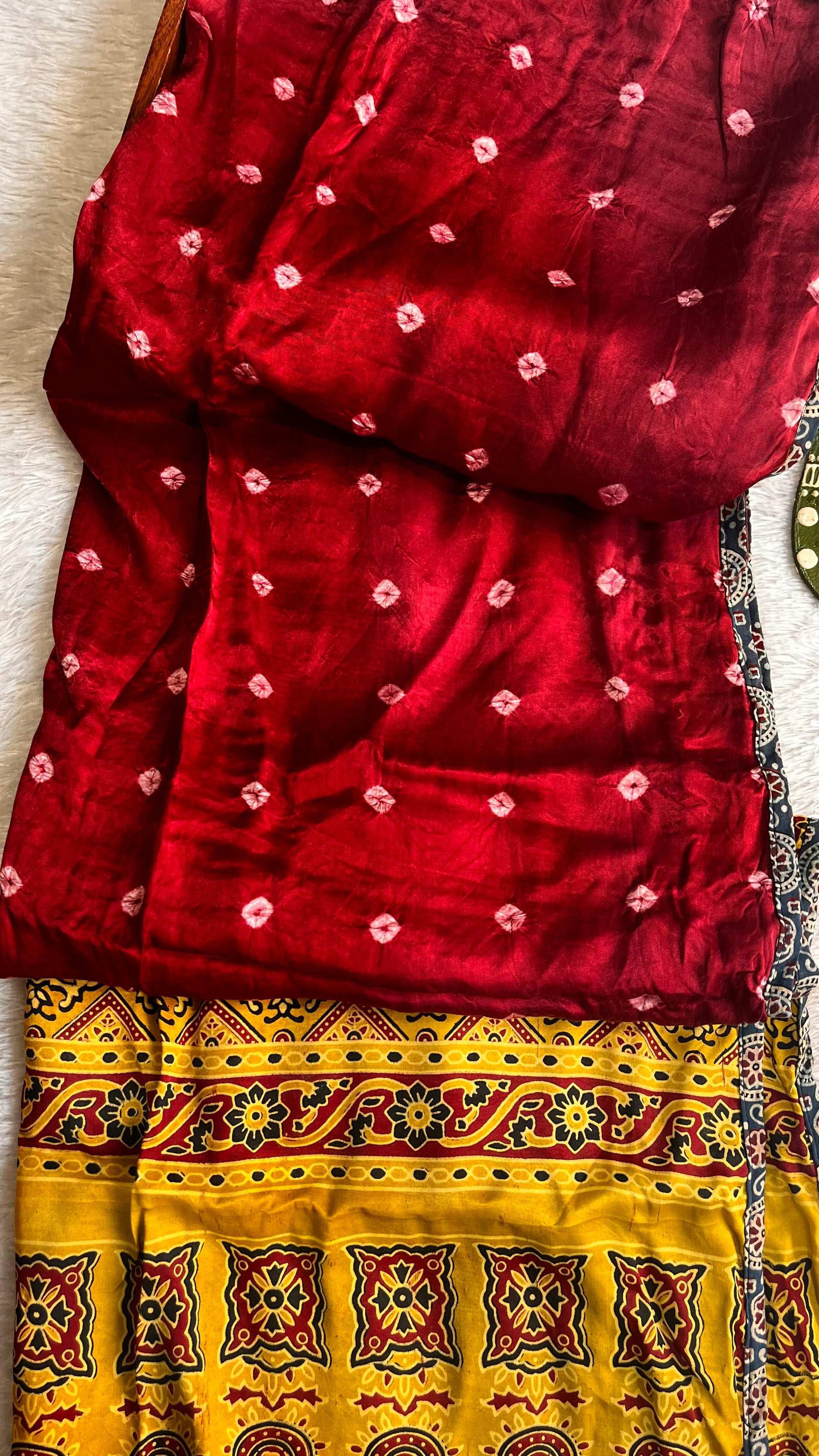Maroon and Yellow Ajrakh Applique Patchwork Modal Silk Kantha Work Dupatta with Tassels