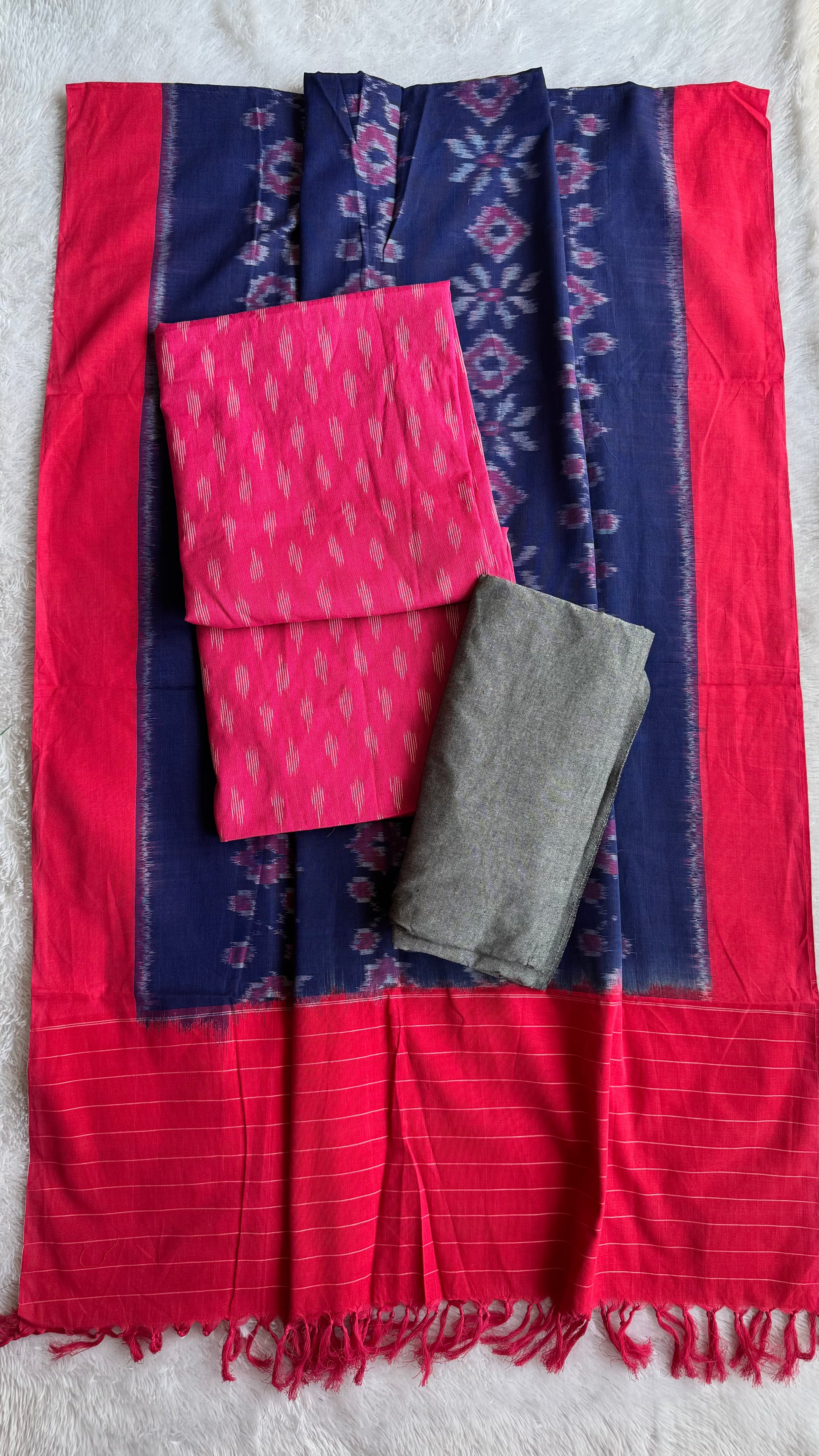Our Pochampally Ikat cotton handloom dress material set from Telangana includes a kurta, dupatta and plain bottom. Made using the unique ikat technique where yarns are dyed before weaving, it features beautiful geometric patterns and vibrant colors. Perfect for weddings, parties or cultural gatherings this elegant set adds a touch of traditional charm to your wardrobe.