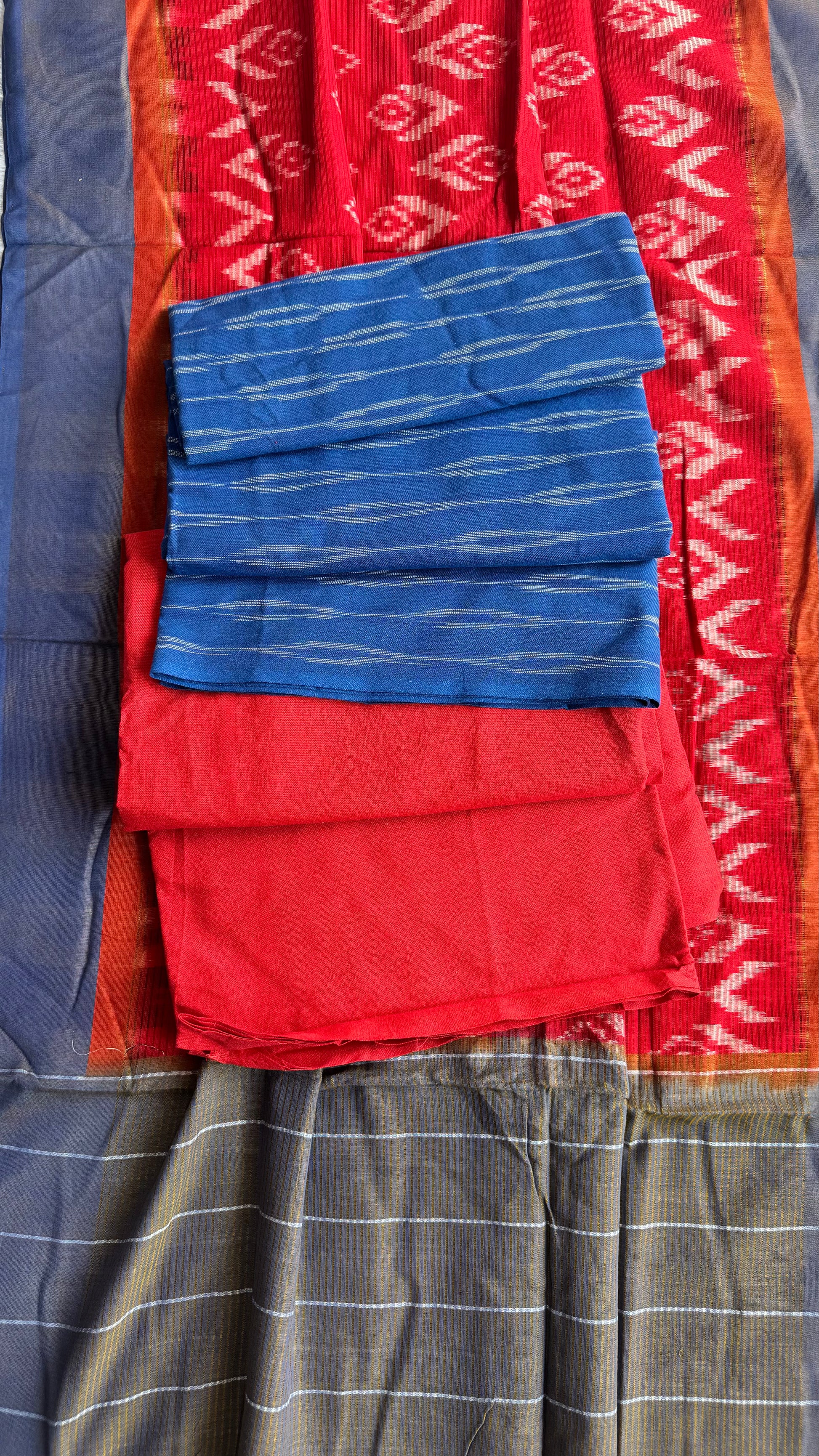 Navy Blue and Red Unstitched Handloom Cotton Pochampally Ikkat Dress Material
