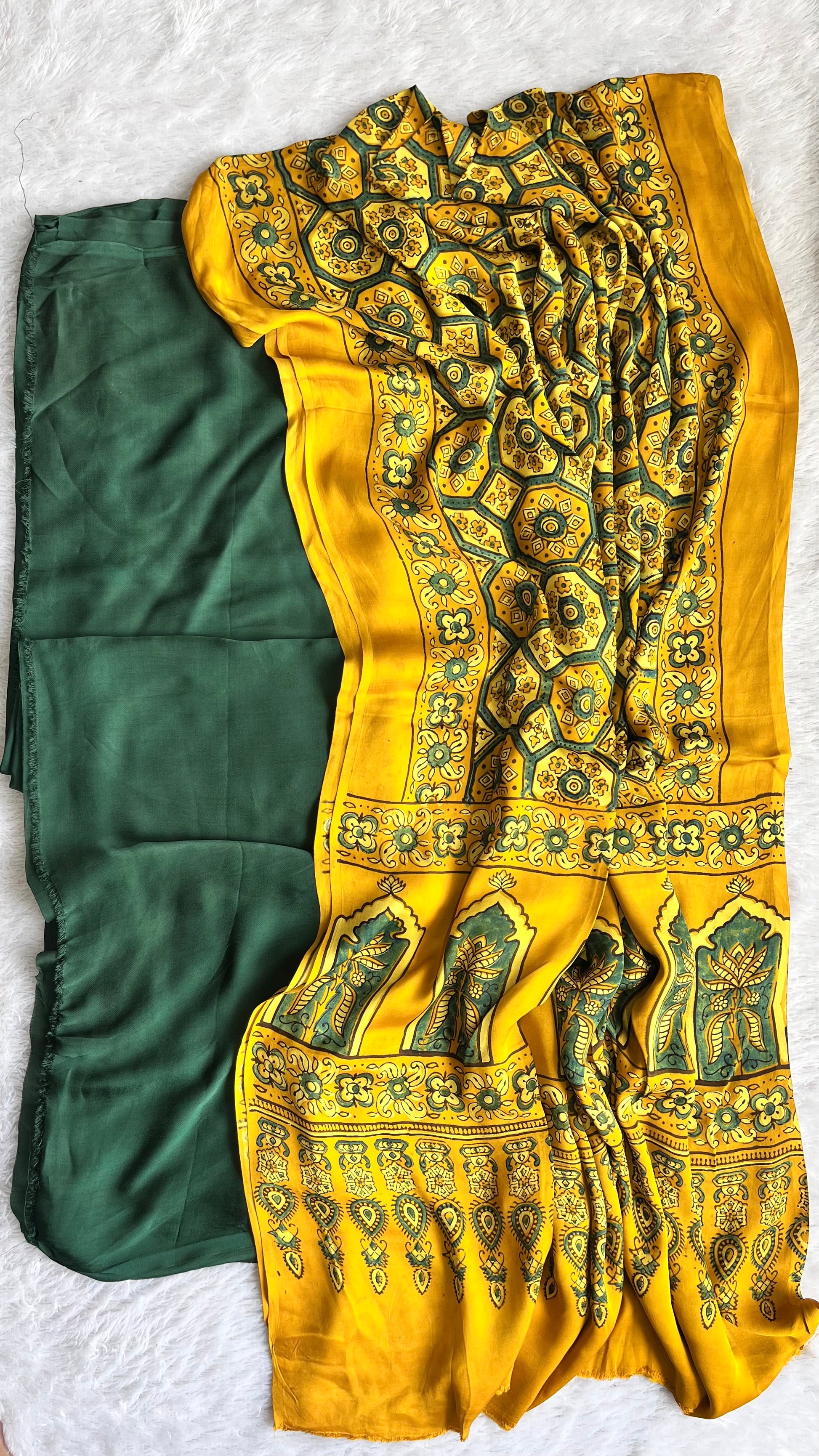 Our fine quality special vanaspati hand block printed modal silk dress material set is made using natural dyes through traditional technique of handblock printing. Modal silk is a soft, shiny and highly lustrous fabric, achieved through interlacing modal fibers and silk yarns. Ajrakh Modal Silk fabric has opulence of silk and the comfort of cotton making it a very fine and soft textured weave. Thank you for choosing handmade!