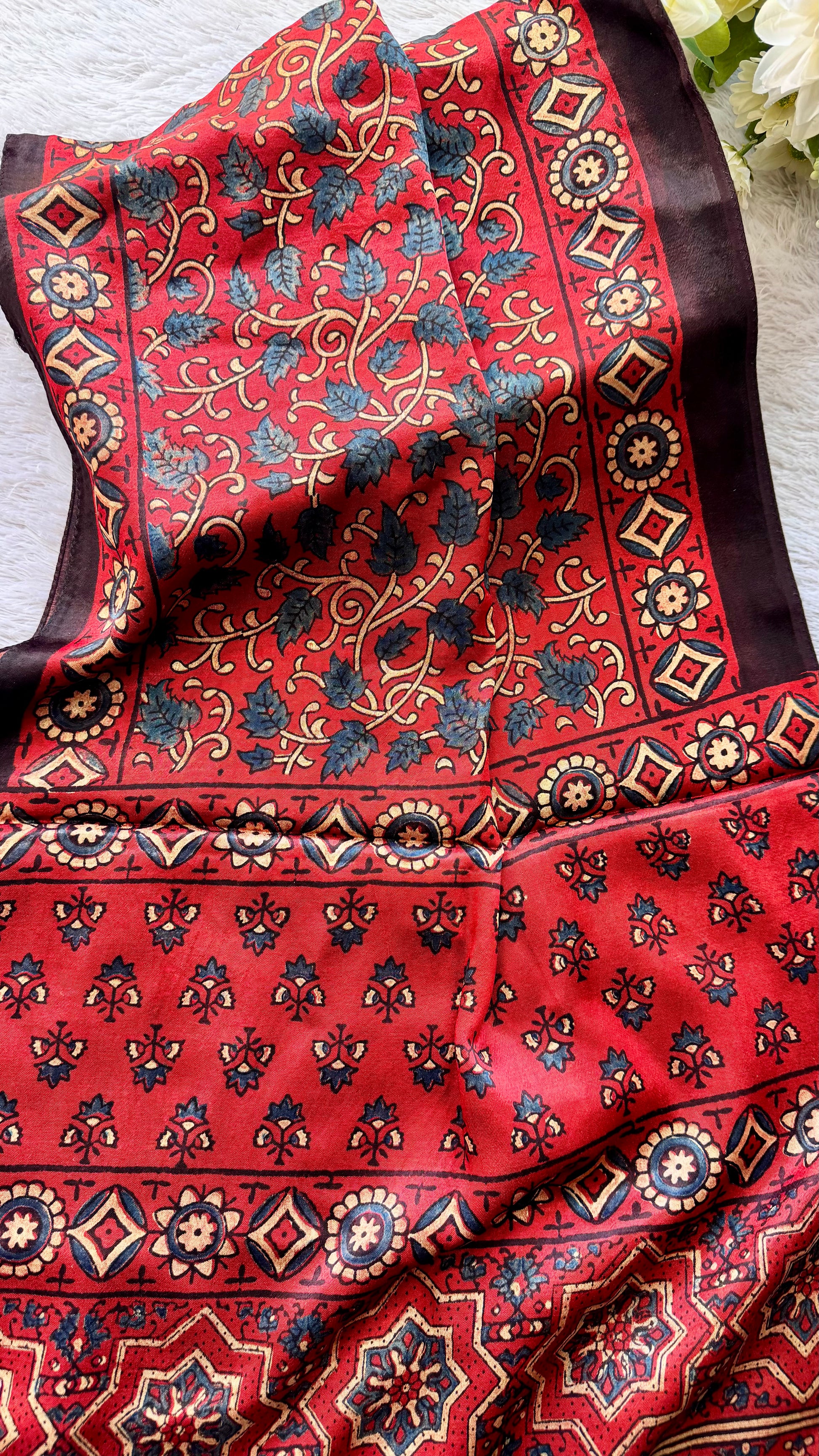 This beautiful and enticing Ajrakh Hand Block Print Mashru Silk Stole made using heritage weaving techniques and hand block printed involving azo-free dyes. Mashru is a traditional weave of India. Its speciality is the manner in which silk and cotton are interwoven such that one side appears to be pure silk and the other side of the stole appears to be pure cotton. The resultant fabric is buttery-soft and glossy. You can only understand the true softness of a Mashru when you touch it and wear it!