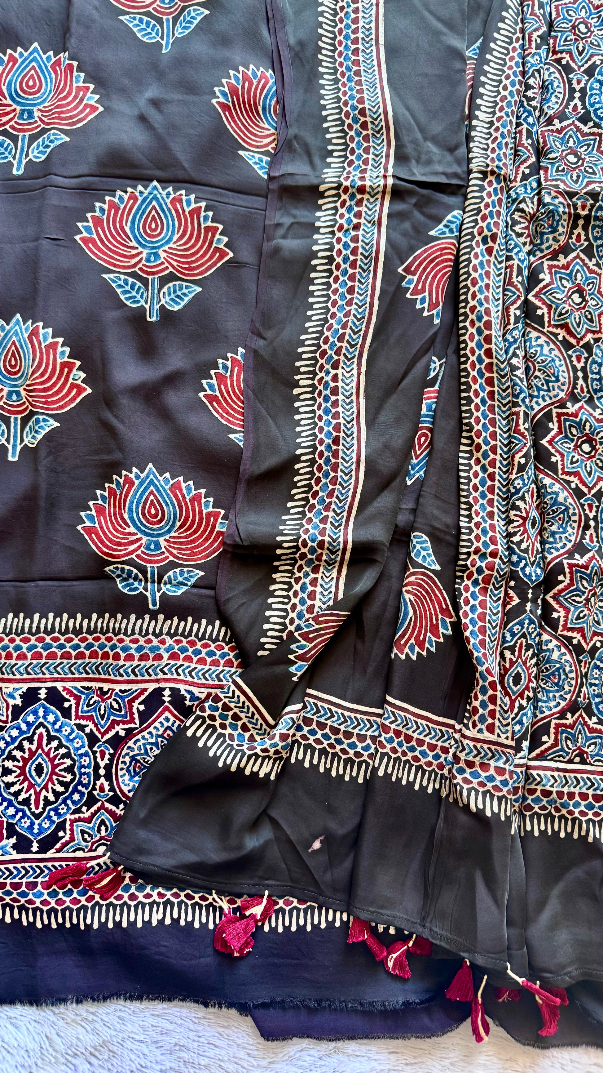 Black Kamal Boota Motif Ajrakh Hand Block Print Modal Silk Suit Material