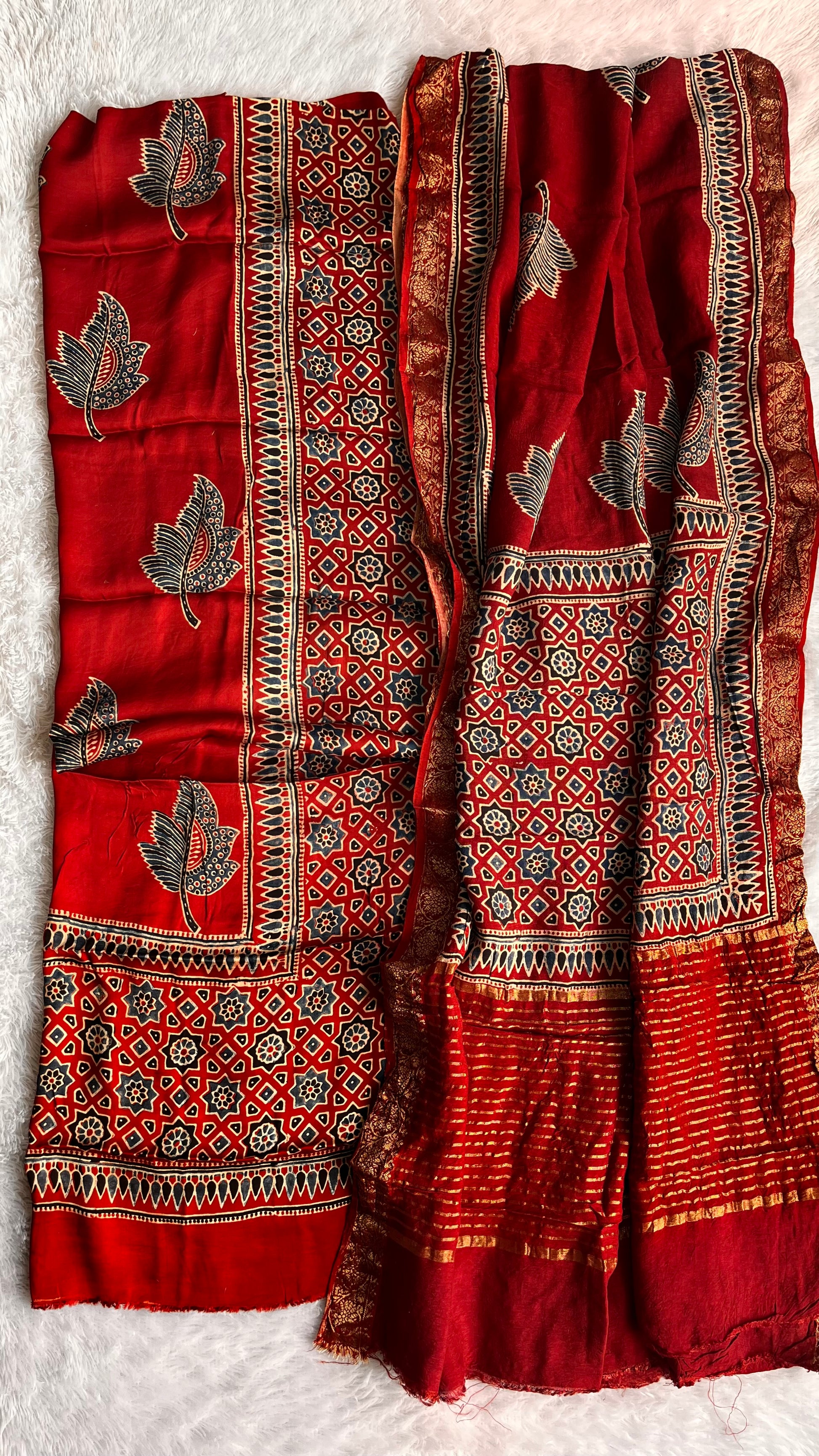 Our fine quality special Ajrakh block printed modal silk dress material set is made using natural dyes through traditional technique of handblock printing by the Khatri community practising Ajrakh Handblock technique in Kutch region of Gujarat for generations. Modal silk is a soft, shiny and highly lustrous fabric, achieved through interlacing modal fibers and silk yarns. Ajrakh Modal Silk fabric has opulence of silk and the comfort of cotton making it a very fine and soft textured weave. Thank you for choosing handmade!
