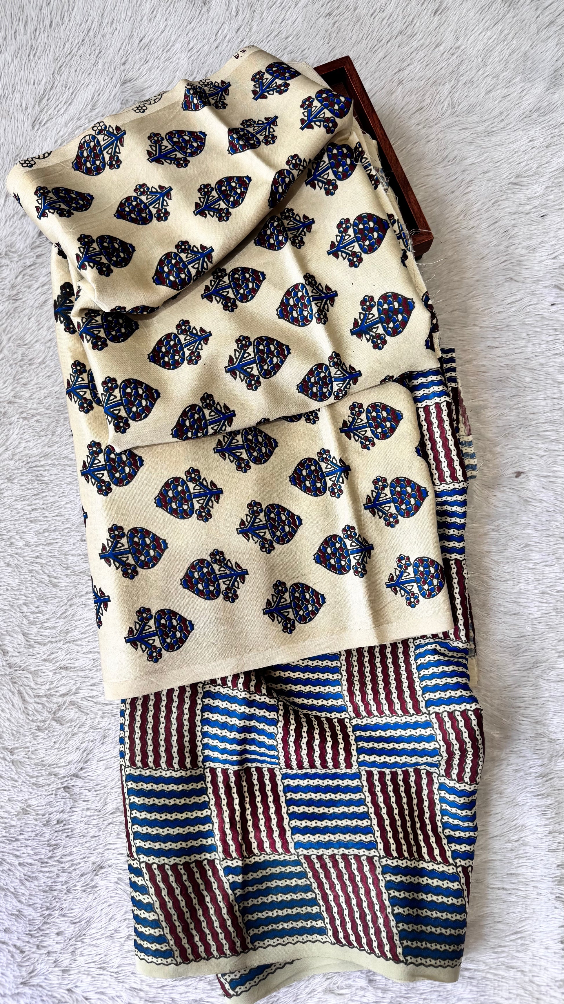Drawing inspiration from timeless artistry, our Ajrakh Mashru Silk fabric is designed to deliver luxurious comfort and elegance. This luxurious fabric features a rich texture and glossy finish, making it perfect for high-end fashion pieces. Its unique ajrakh hand block print and use of natural dyes contribute to its exclusivity. And with its thicker fabric, it eliminates the need for lining.