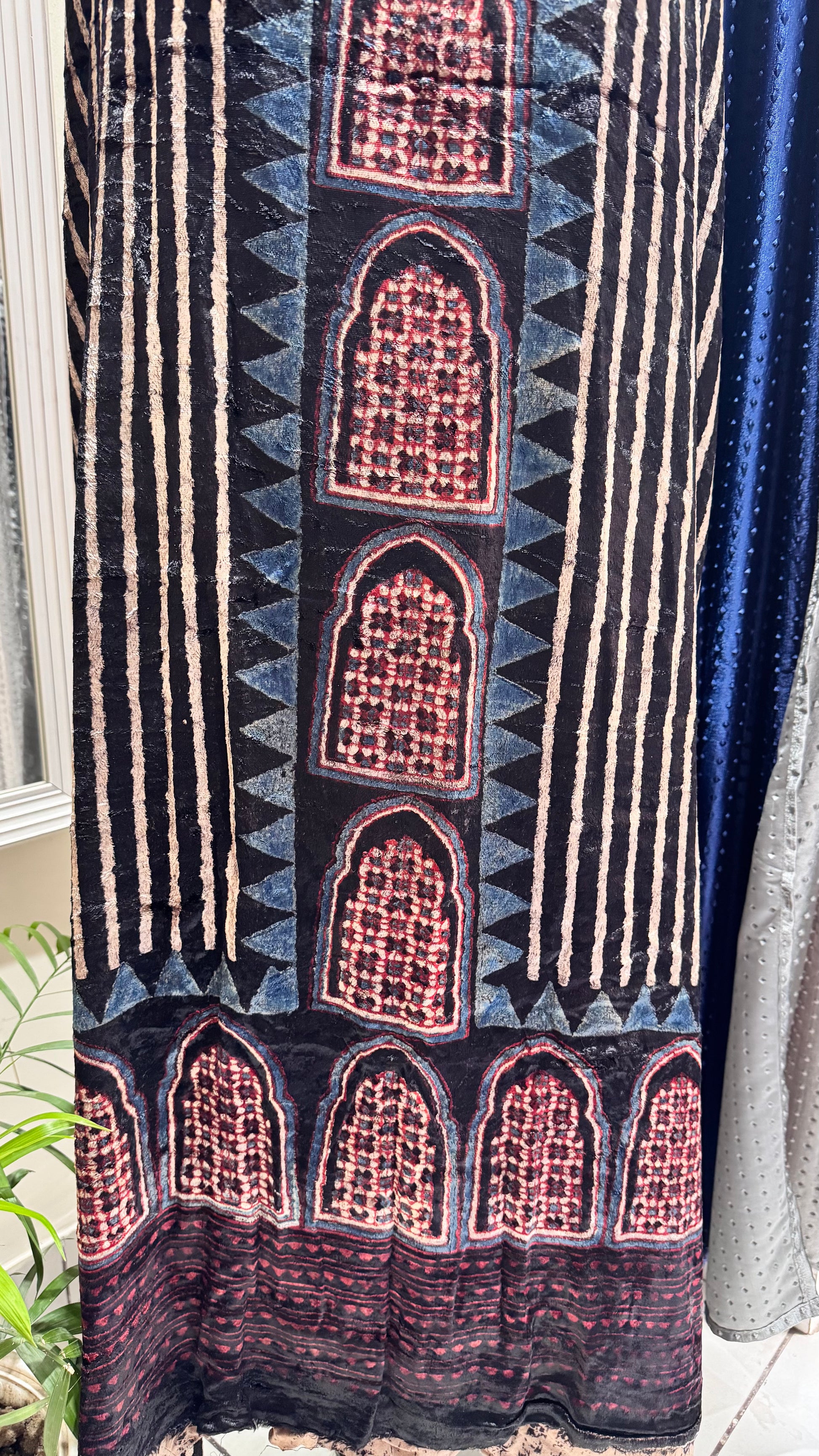 Black Jharokha Buta Velvet Fabric Ajrakh Hand Block Print Designer Unstitched Fabric (Kurta Only)