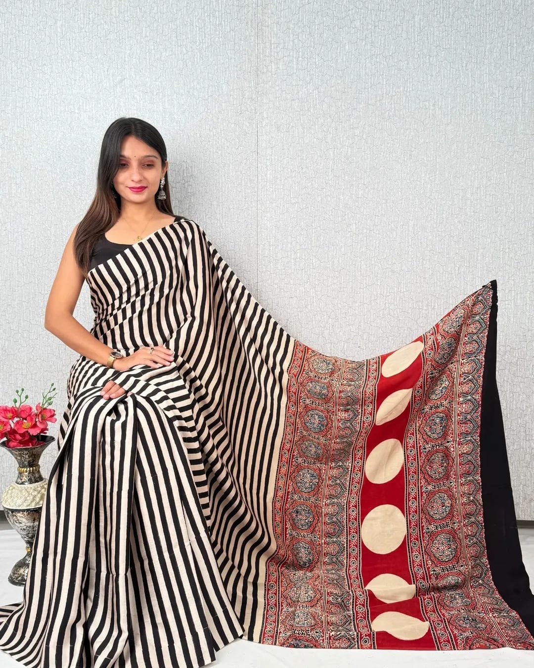 Viral Black Stripe Ajrakh Hand Block Natural Dye Modal Silk Saree With Blouse