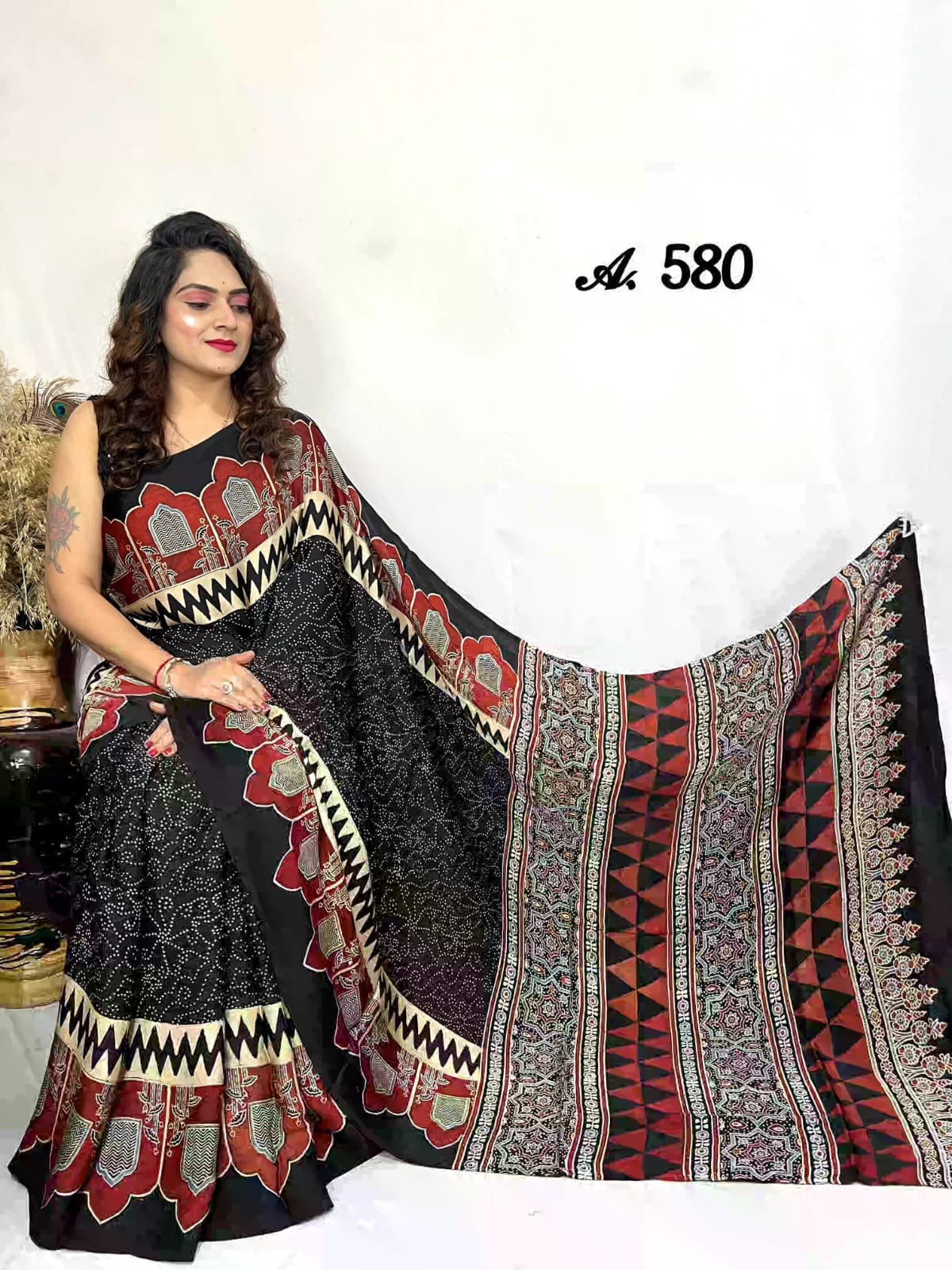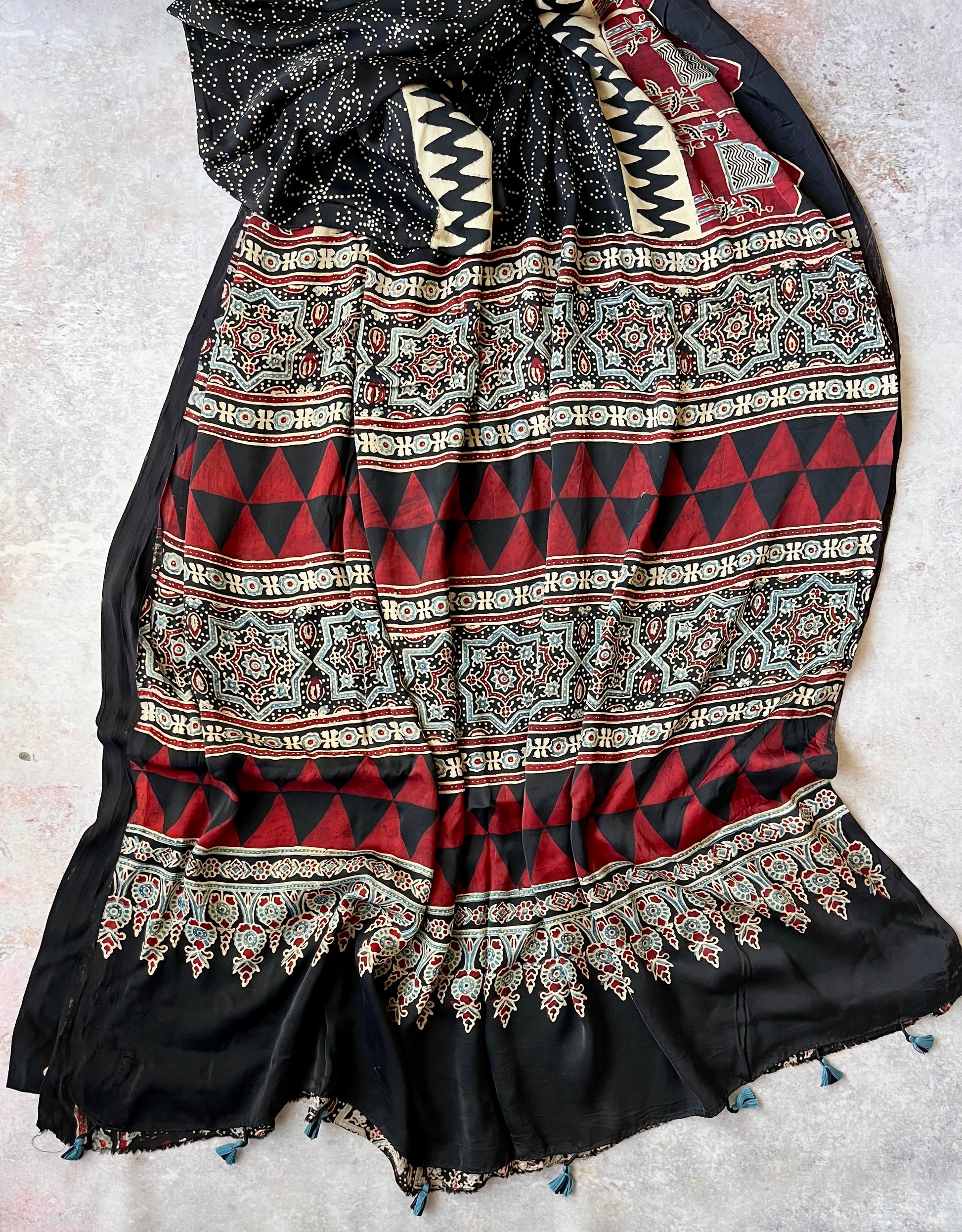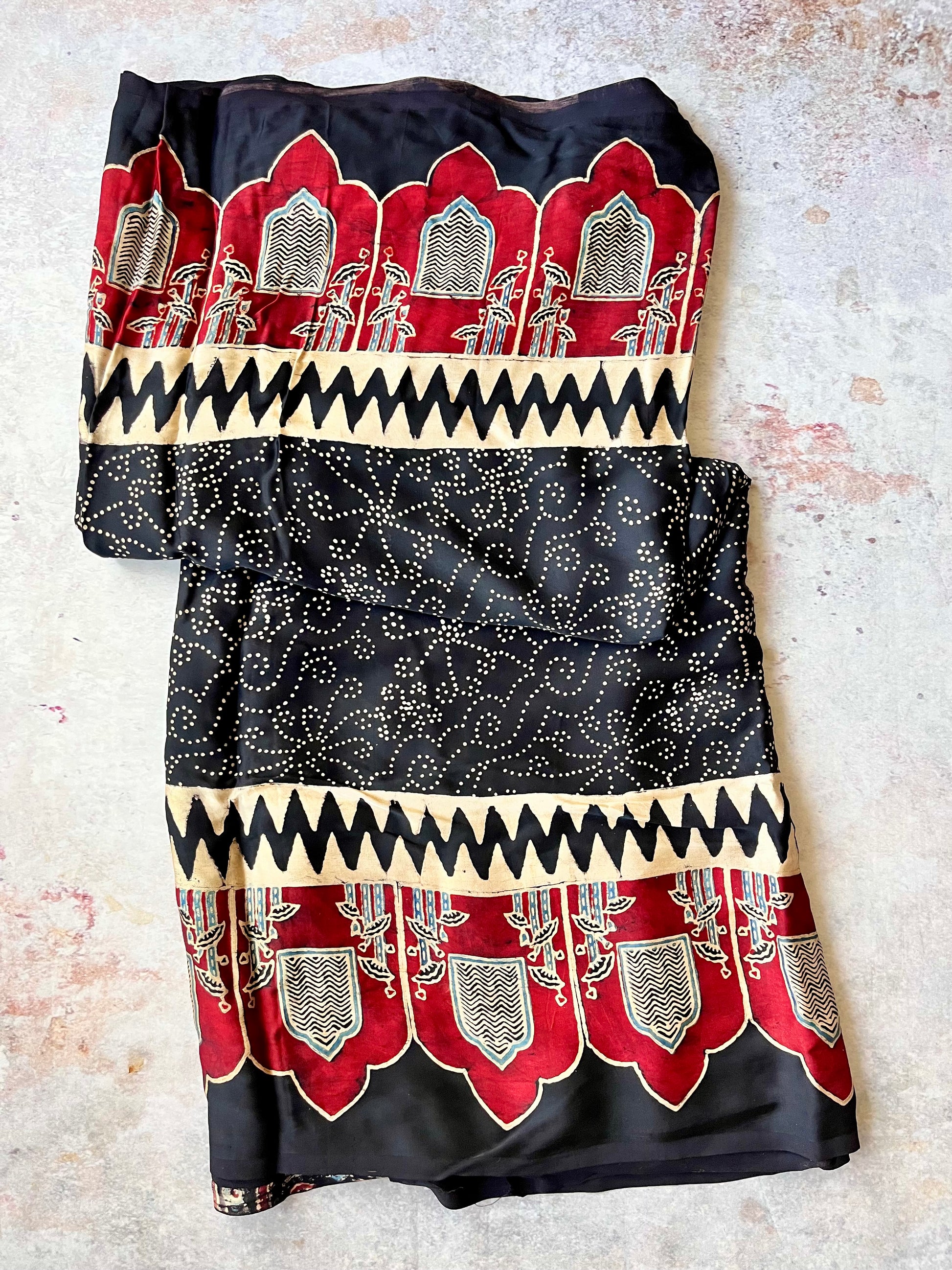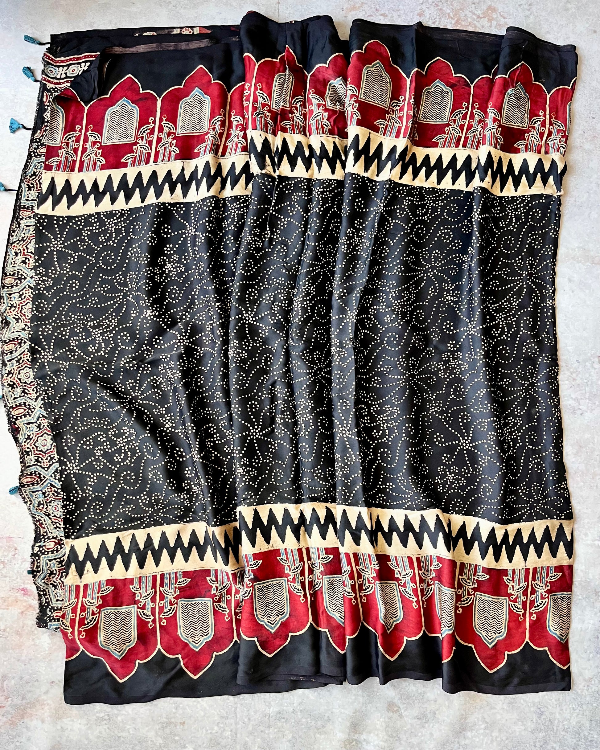 Black Rie Bandhej Jharokha Motif Ajrakh Hand Block Modal Silk Saree With Blouse