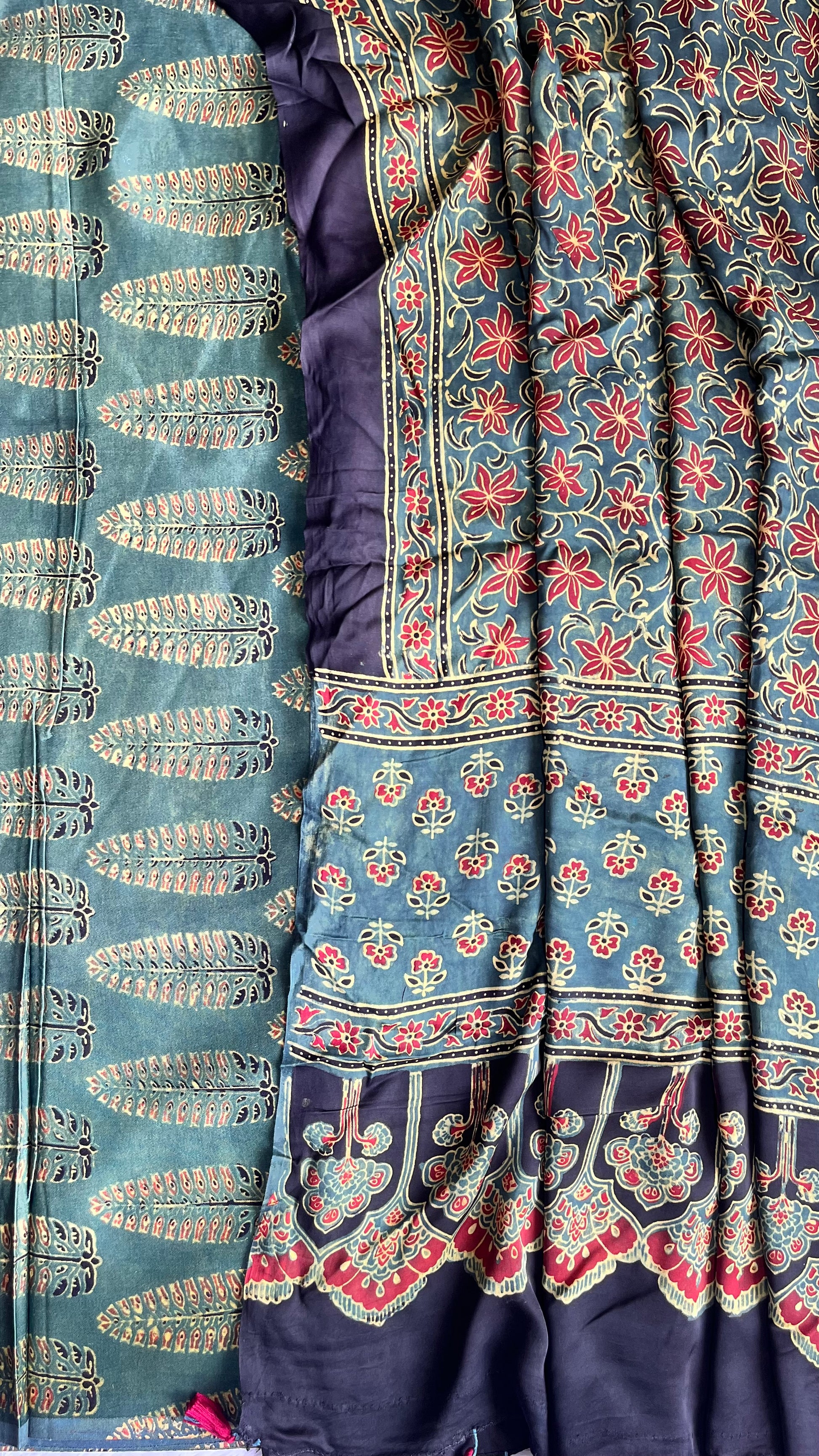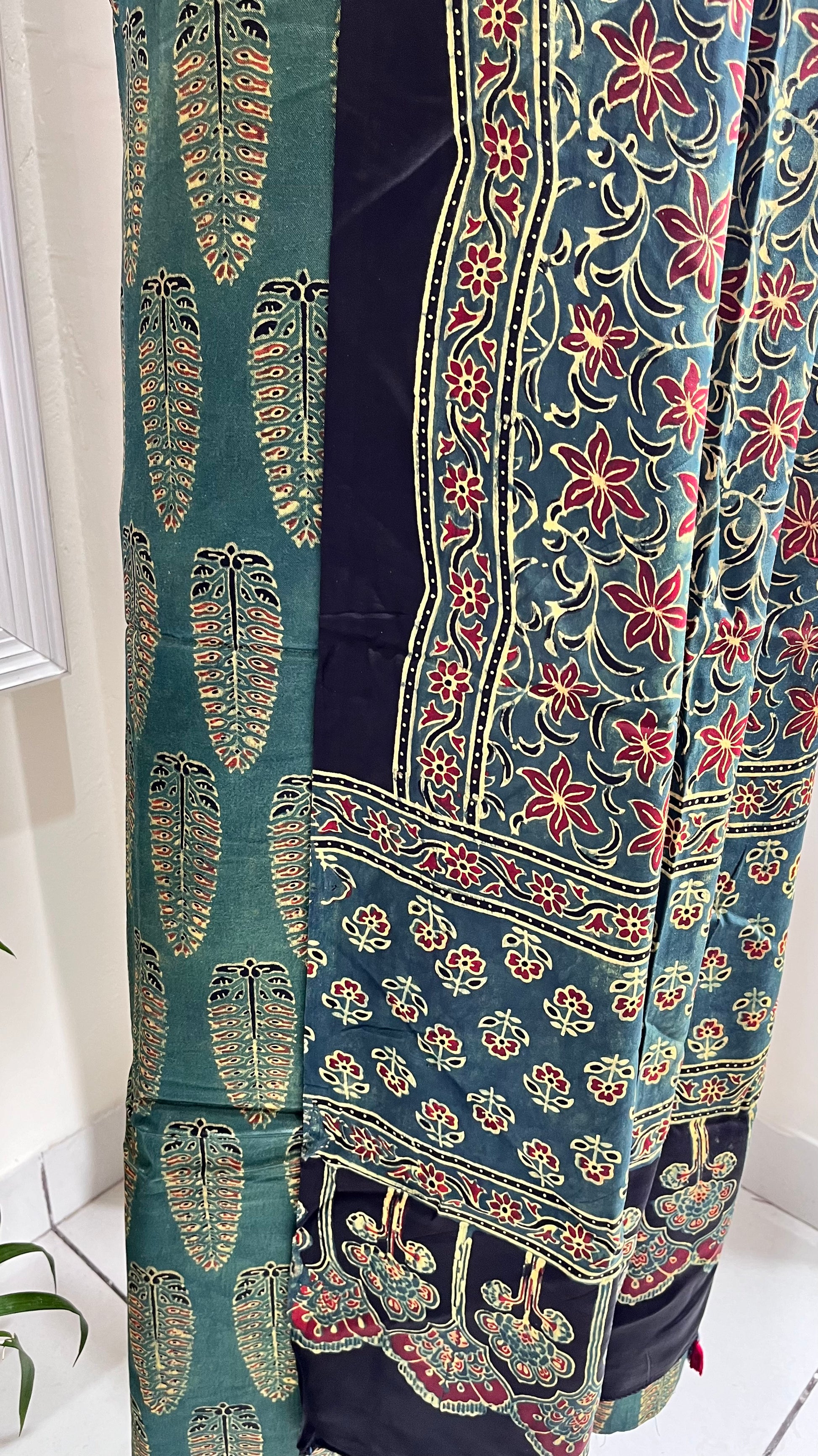 Our fine quality special Ajrakh block printed modal silk dress material set is made using natural dyes through traditional technique of handblock printing by the Khatri community practising Ajrakh Handblock technique in Kutch region of Gujarat for generations. Modal silk is a soft, shiny and highly lustrous fabric, achieved through interlacing modal fibers and silk yarns. Ajrakh Modal Silk fabric has opulence of silk and the comfort of cotton making it a very fine and soft textured weave. Thank you for choosing handmade!