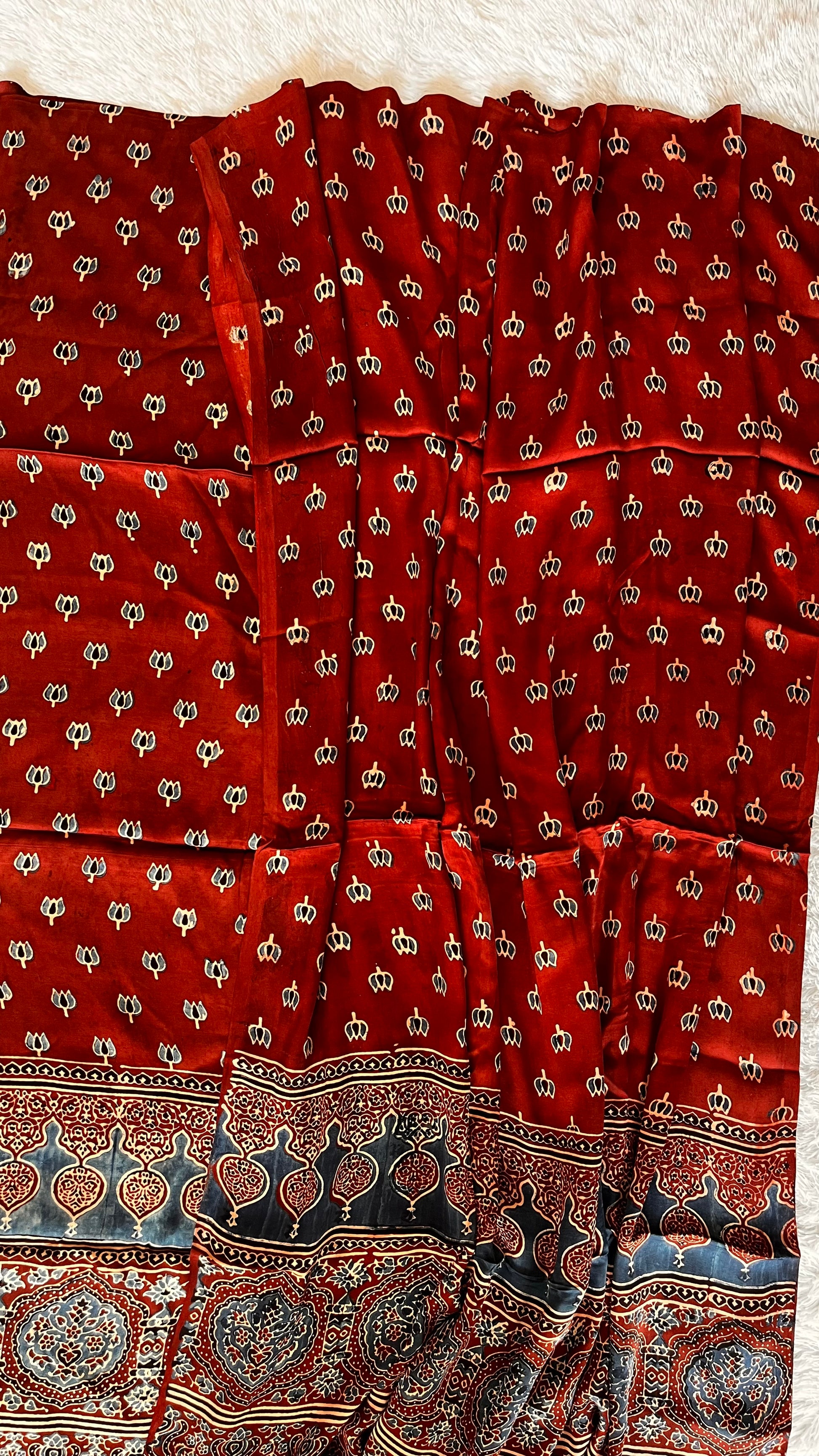 Our fine quality special Ajrakh block printed modal silk dress material set is made using natural dyes through traditional technique of handblock printing by the Khatri community practising Ajrakh Handblock technique in Kutch region of Gujarat for generations. Modal silk is a soft, shiny and highly lustrous fabric, achieved through interlacing modal fibers and silk yarns. Ajrakh Modal Silk fabric has opulence of silk and the comfort of cotton making it a very fine and soft textured weave. Thank you for choosing handmade!