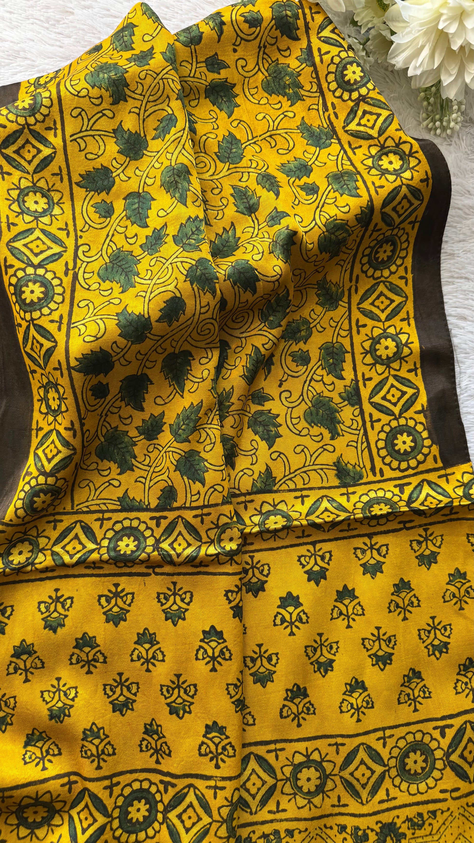 Yellow Shade Black Leaf Motif Ajrakh Hand Block Print Mashru Silk Stole with Tassels