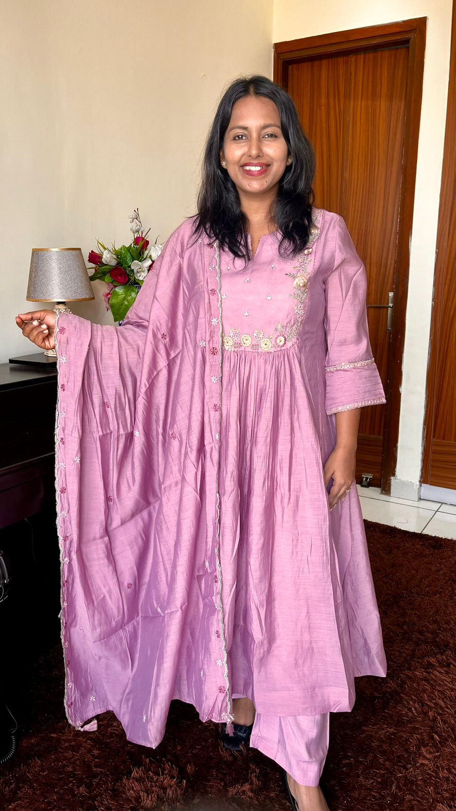 Pyaazi Pink Mul Chanderi Suit Set with Inner Lining and Embroidered Yoke