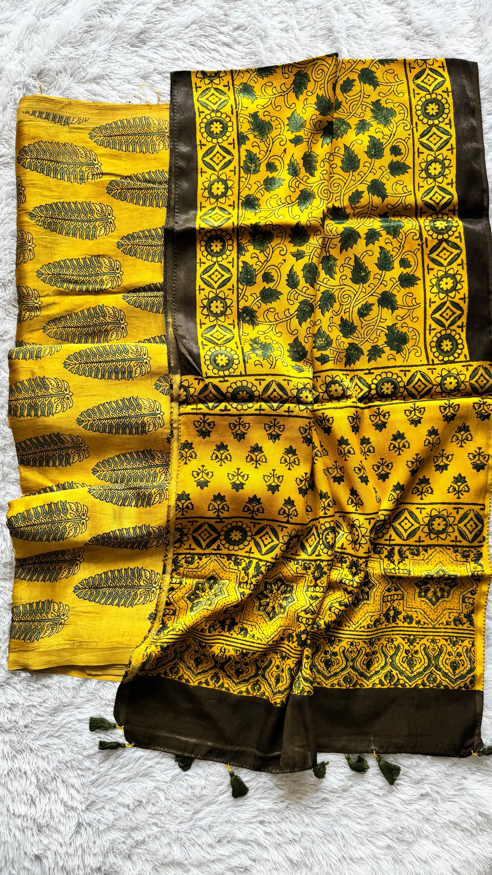 Haldi Yellow Leaf Motif Mashru Kurta fabric with Ajrakh Mashru Tasseled Silk Stole