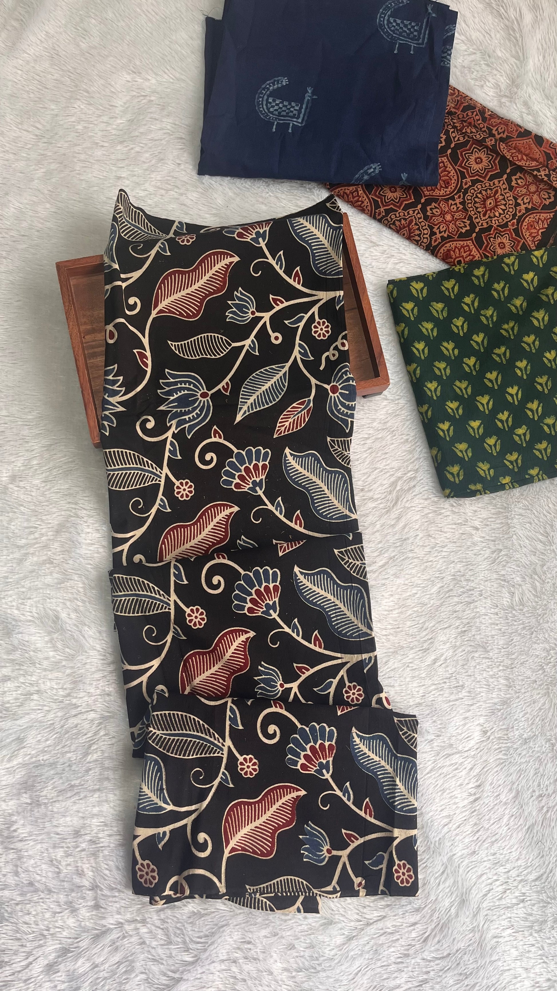 Jet Black Floral Motif Ajrakh Hand Block Printed Cotton Blouse Fabric