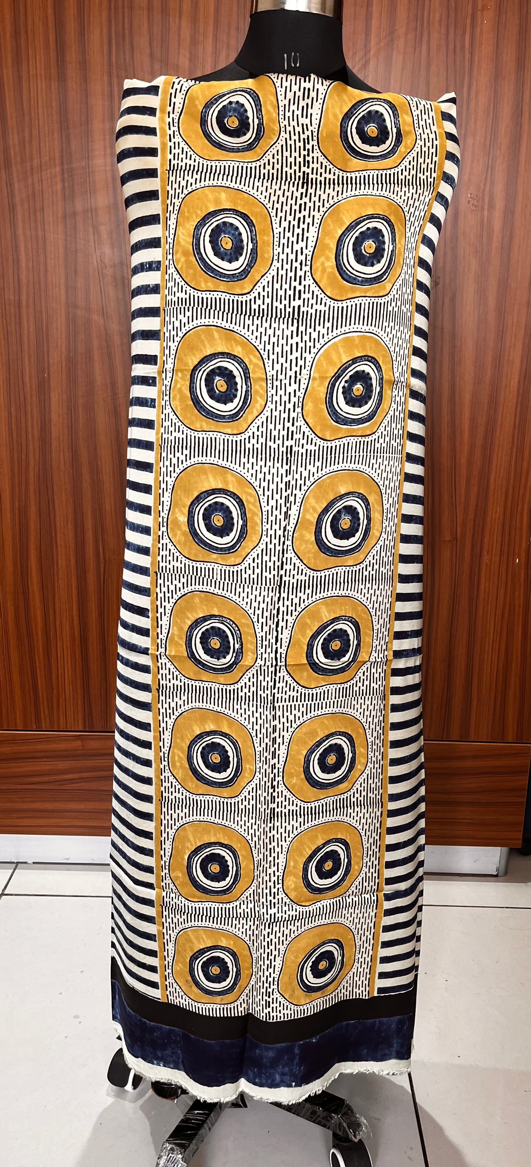 Blue and Mustard Circle Motif Modal Silk Ajrakh Hand Block Print Designer Unstitched Fabric (Kurta Only)