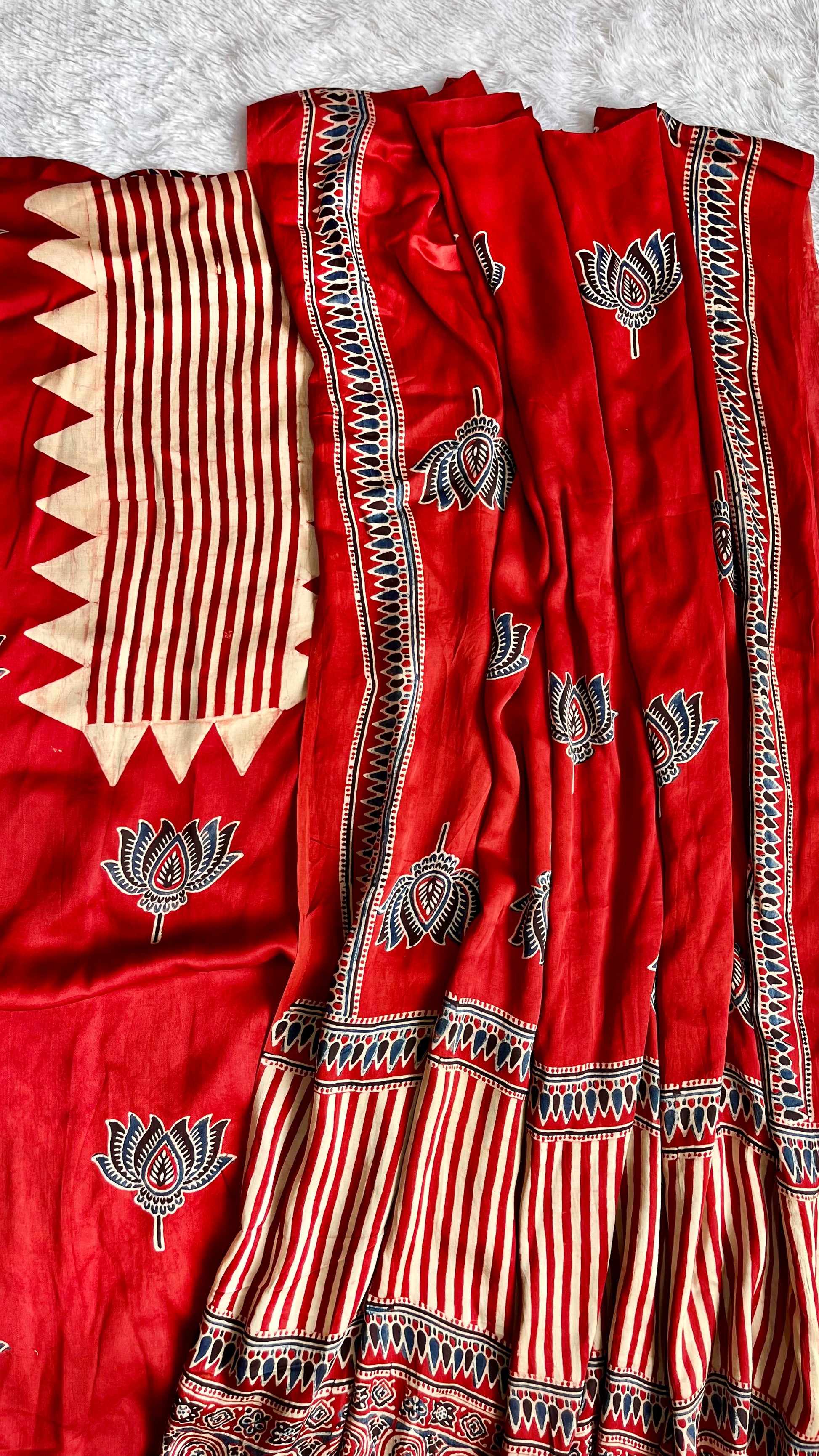 Our fine quality special Ajrakh block printed modal silk dress material set is made using natural dyes through traditional technique of handblock printing by the Khatri community practising Ajrakh Handblock technique in Kutch region of Gujarat for generations. Modal silk is a soft, shiny and highly lustrous fabric, achieved through interlacing modal fibers and silk yarns. Ajrakh Modal Silk fabric has opulence of silk and the comfort of cotton making it a very fine and soft textured weave. Thank you for choosing handmade!