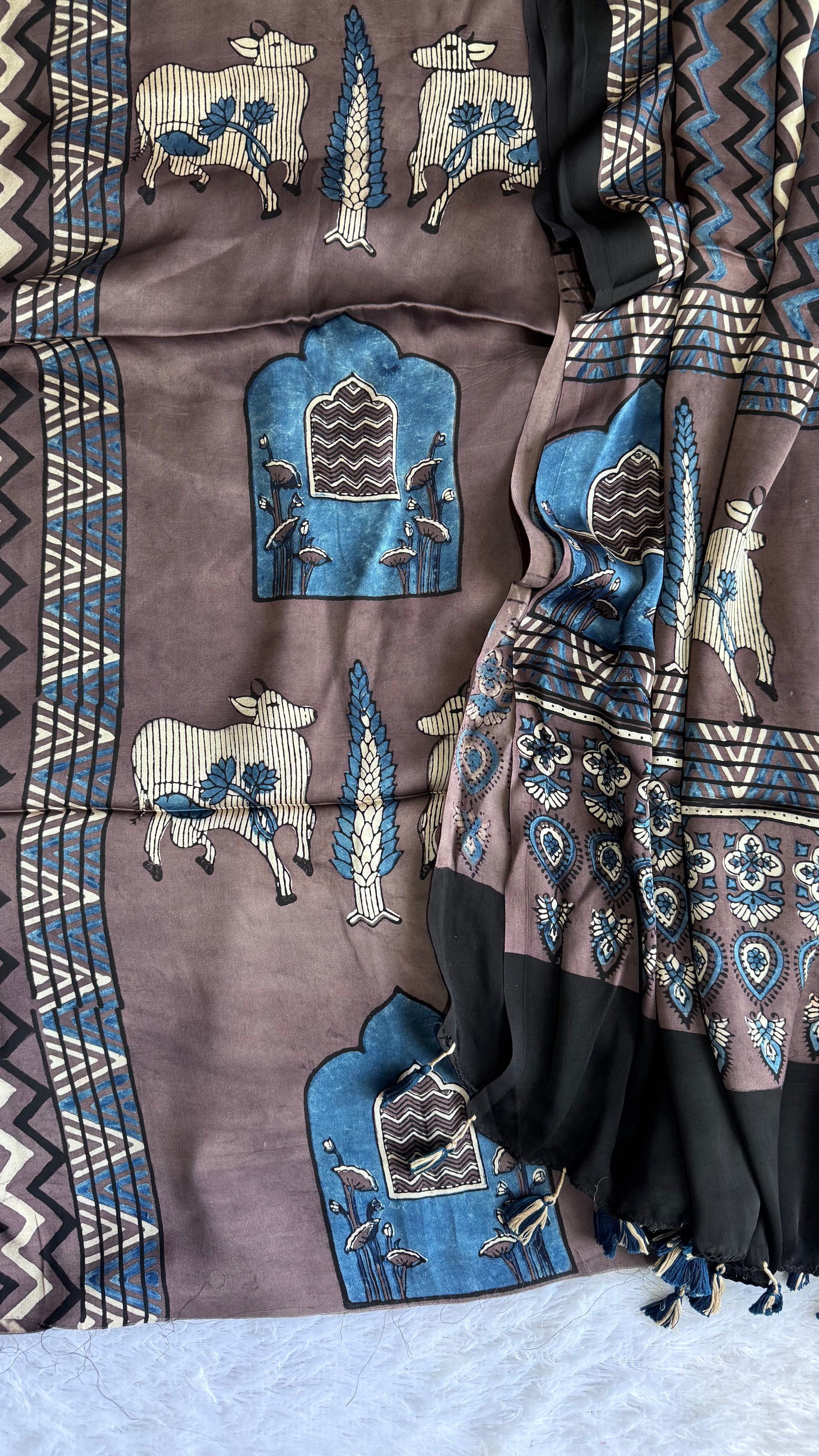 Ash Brown Kamdhenu Motif Modal Silk Ajrakh Natural Dyed Hand Block Print 2pc Suit Material Set