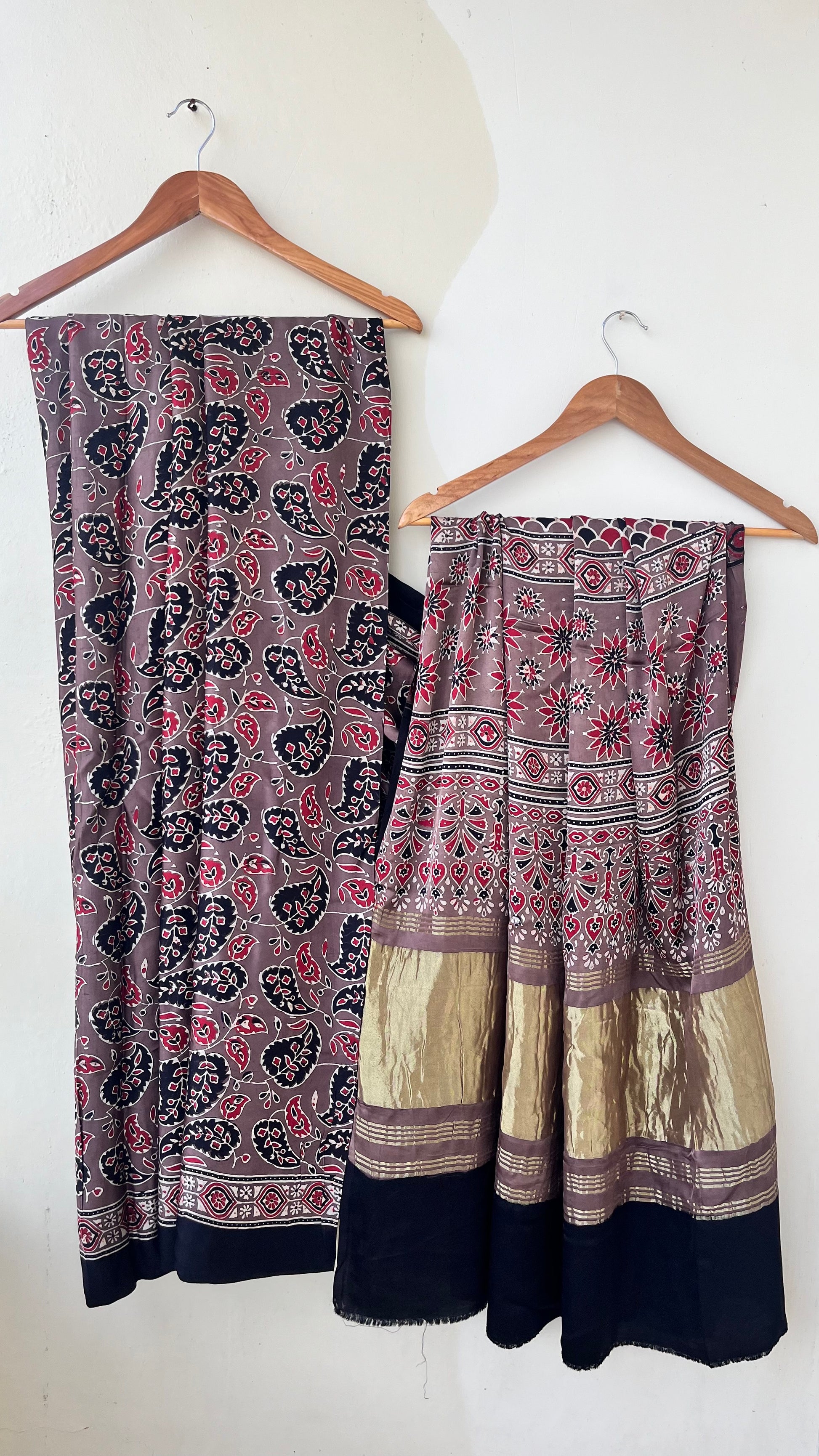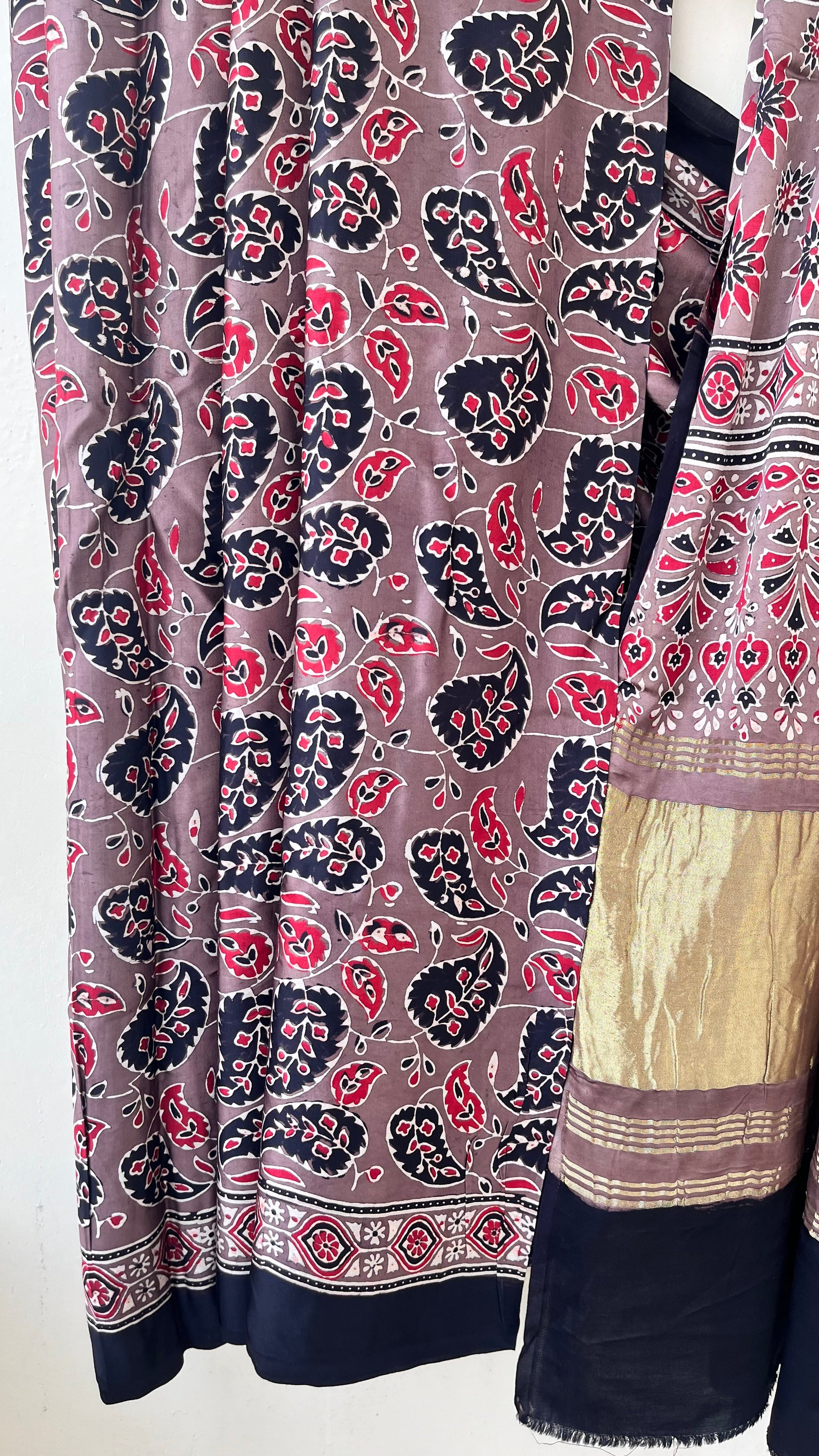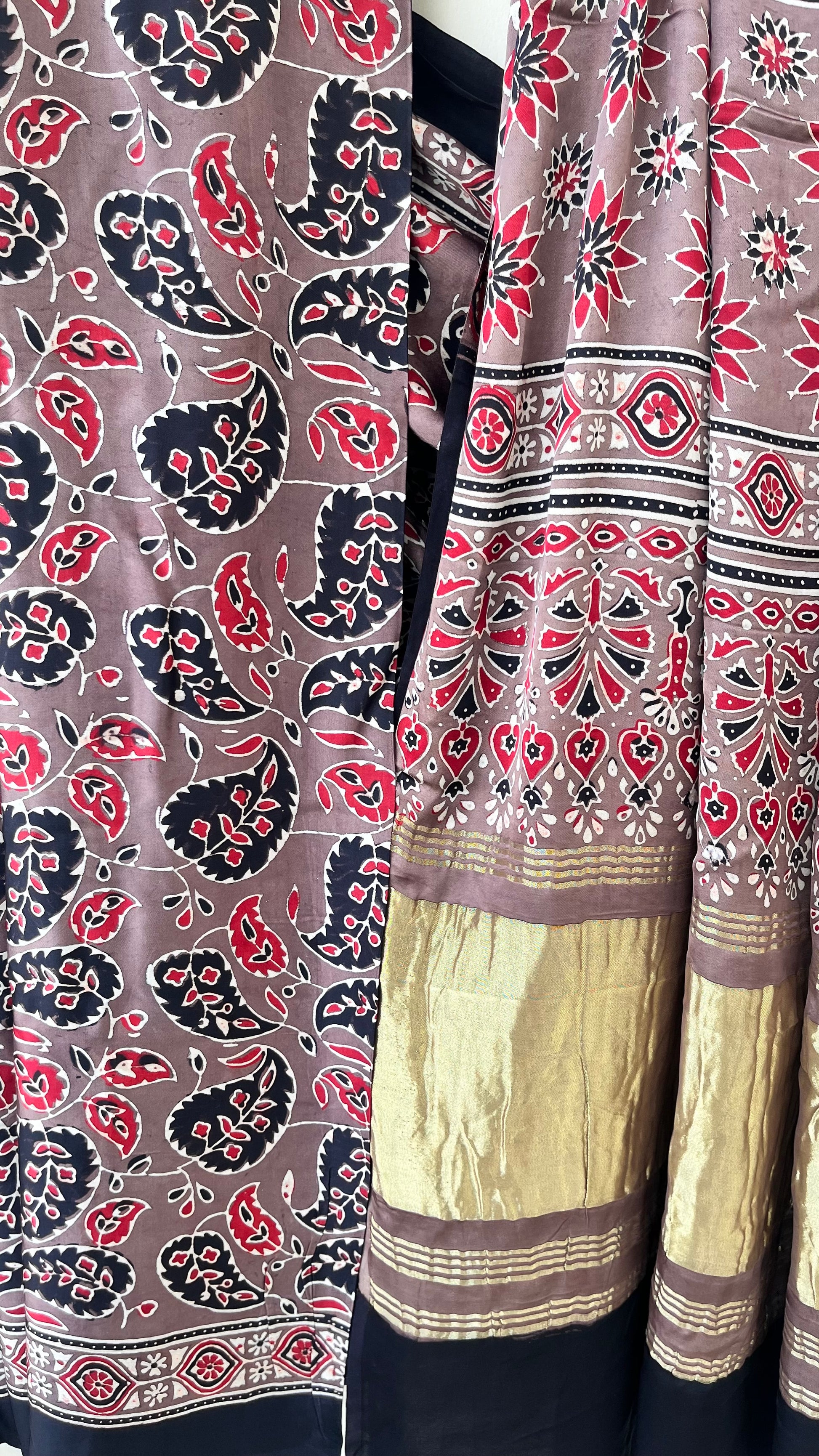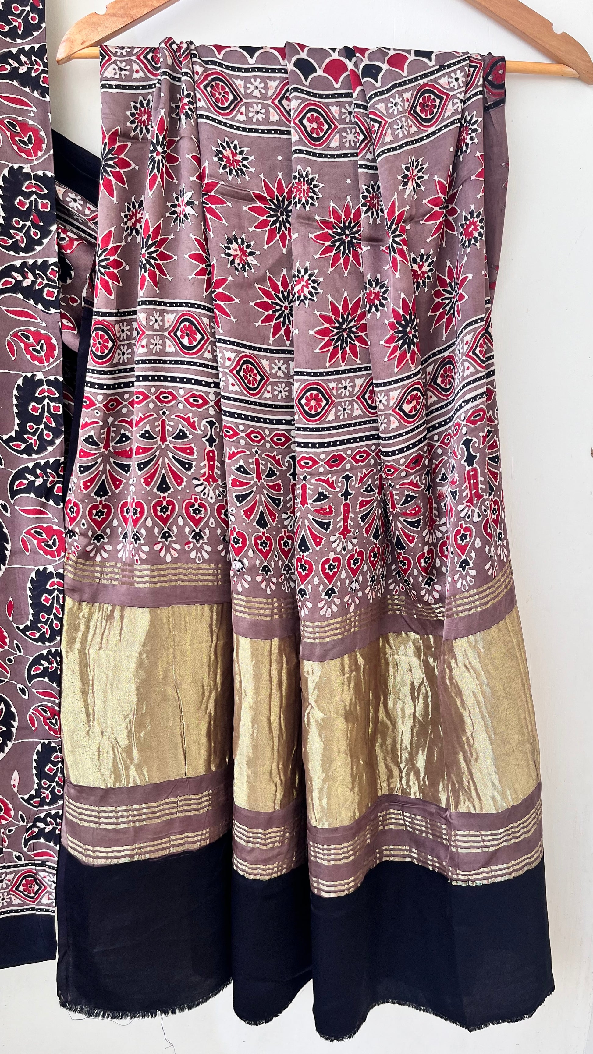 Our entrancing collection of authentic handcrafted Ajrakh modal silk sarees are an outcome of nature made with absolute love and patience. Handcrafted with vegetable dyes, the craft of Ajrakh hand-block printing is practised by the artisans in Kutch region of Gujarat. These eye pleasing modal silk ajrakh sarees immerse you with grace, poise and helps you stand out from the crowd. Each saree comes with a matching blouse piece. Thank you for looking and supporting handmade!