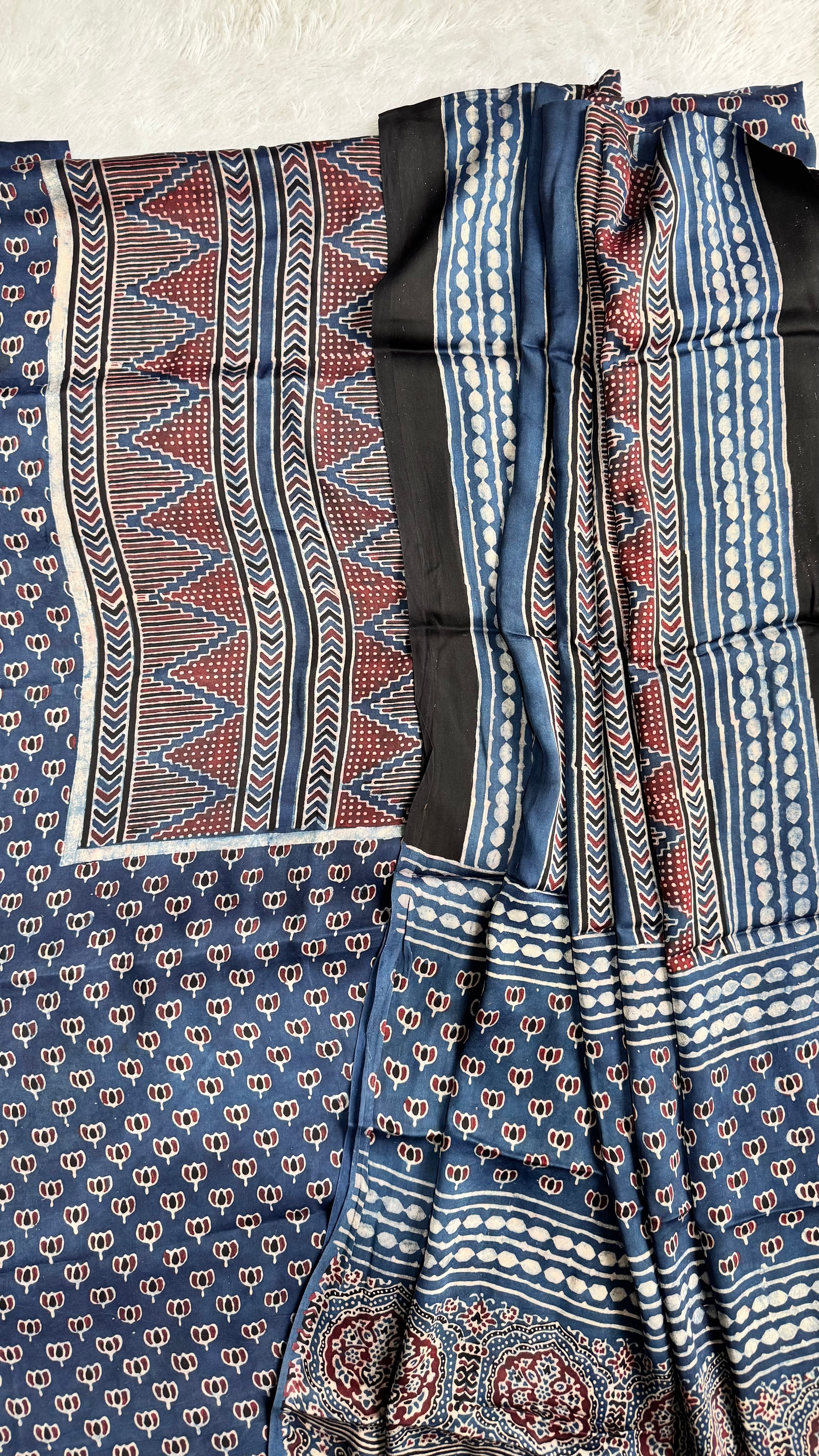 Our fine quality special Ajrakh block printed modal silk dress material set is made using natural dyes through traditional technique of handblock printing by the Khatri community practising Ajrakh Handblock technique in Kutch region of Gujarat for generations. Modal silk is a soft, shiny and highly lustrous fabric, achieved through interlacing modal fibers and silk yarns. Ajrakh Modal Silk fabric has opulence of silk and the comfort of cotton making it a very fine and soft textured weave. Thank you for choosing handmade!