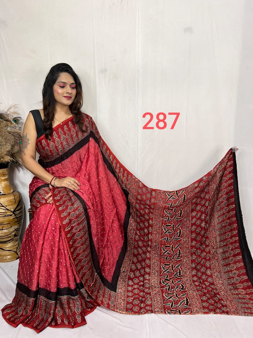 Our entrancing collection of authentic handcrafted Ajrakh modal silk sarees are an outcome of nature made with absolute love and patience. Handcrafted with vegetable dyes, the craft of Ajrakh hand-block printing is practised by the artisans in Kutch region of Gujarat. These eye pleasing modal silk ajrakh sarees immerse you with grace, poise and helps you stand out from the crowd. Each saree comes with a matching blouse piece. Thank you for looking and supporting handmade!