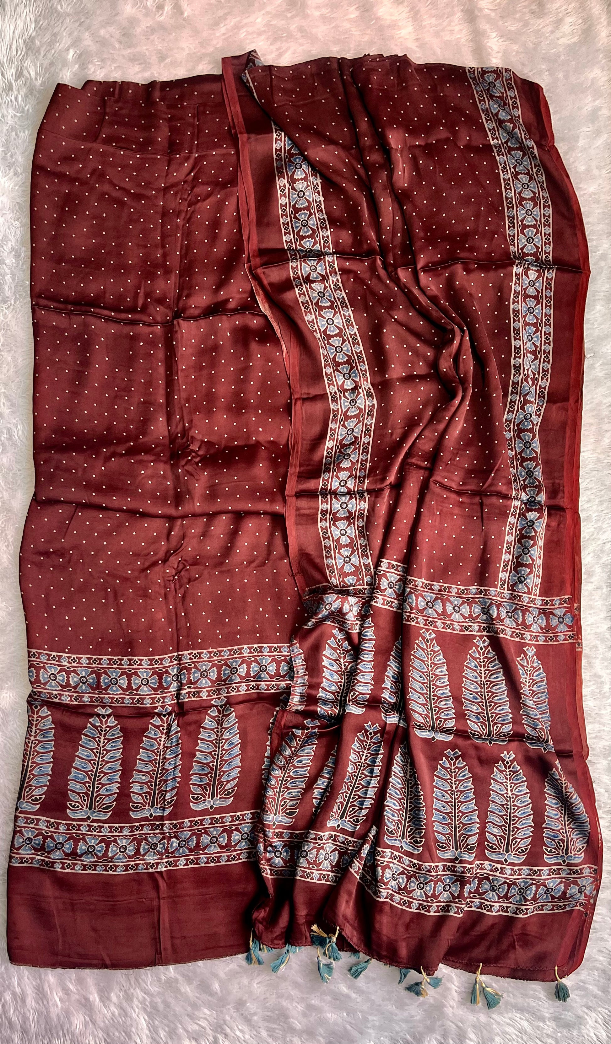 Warm Caramel Polka and Asopallav Motif Ajrakh Hand Block Print Chanderi Silk Suit Material