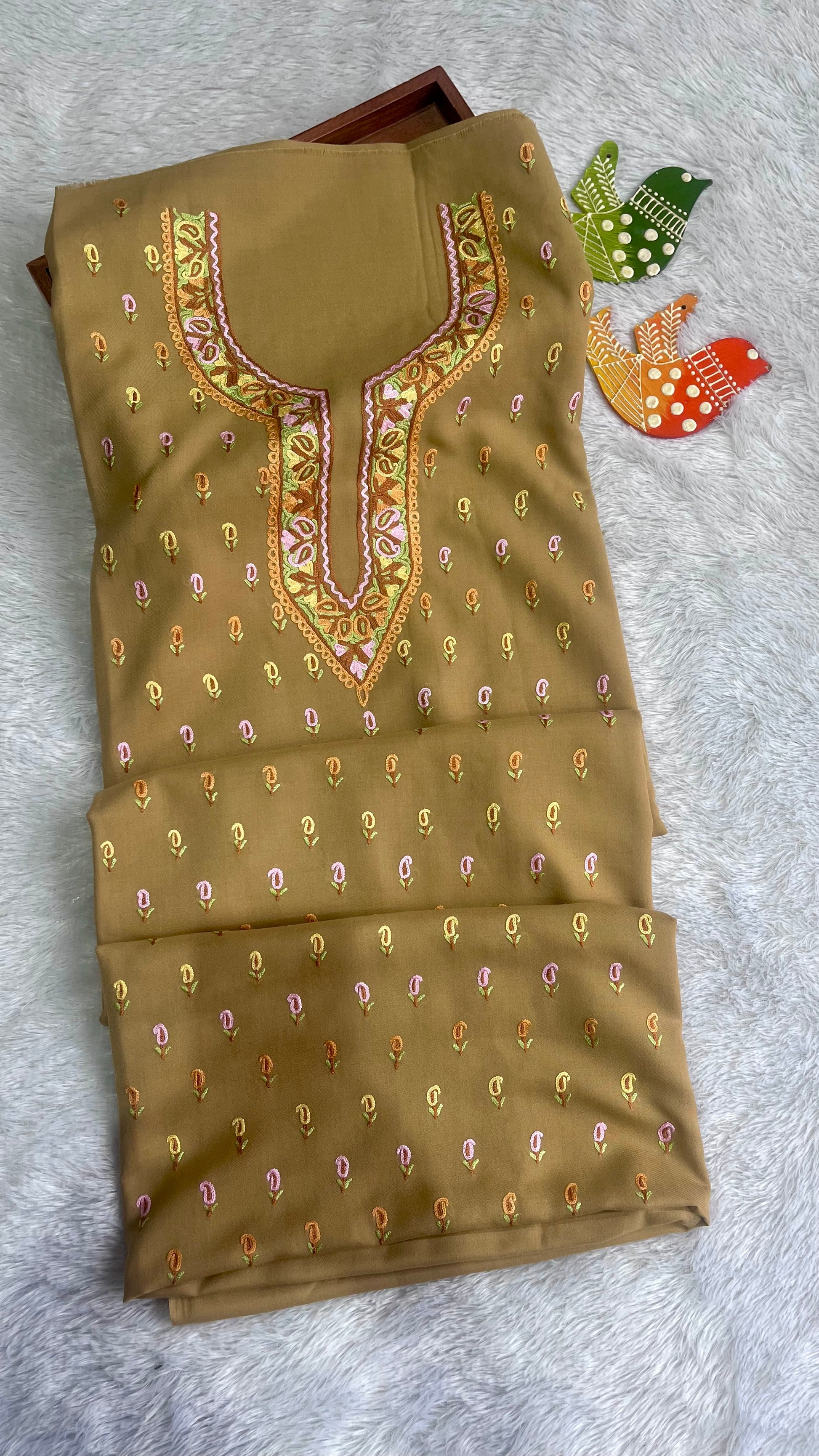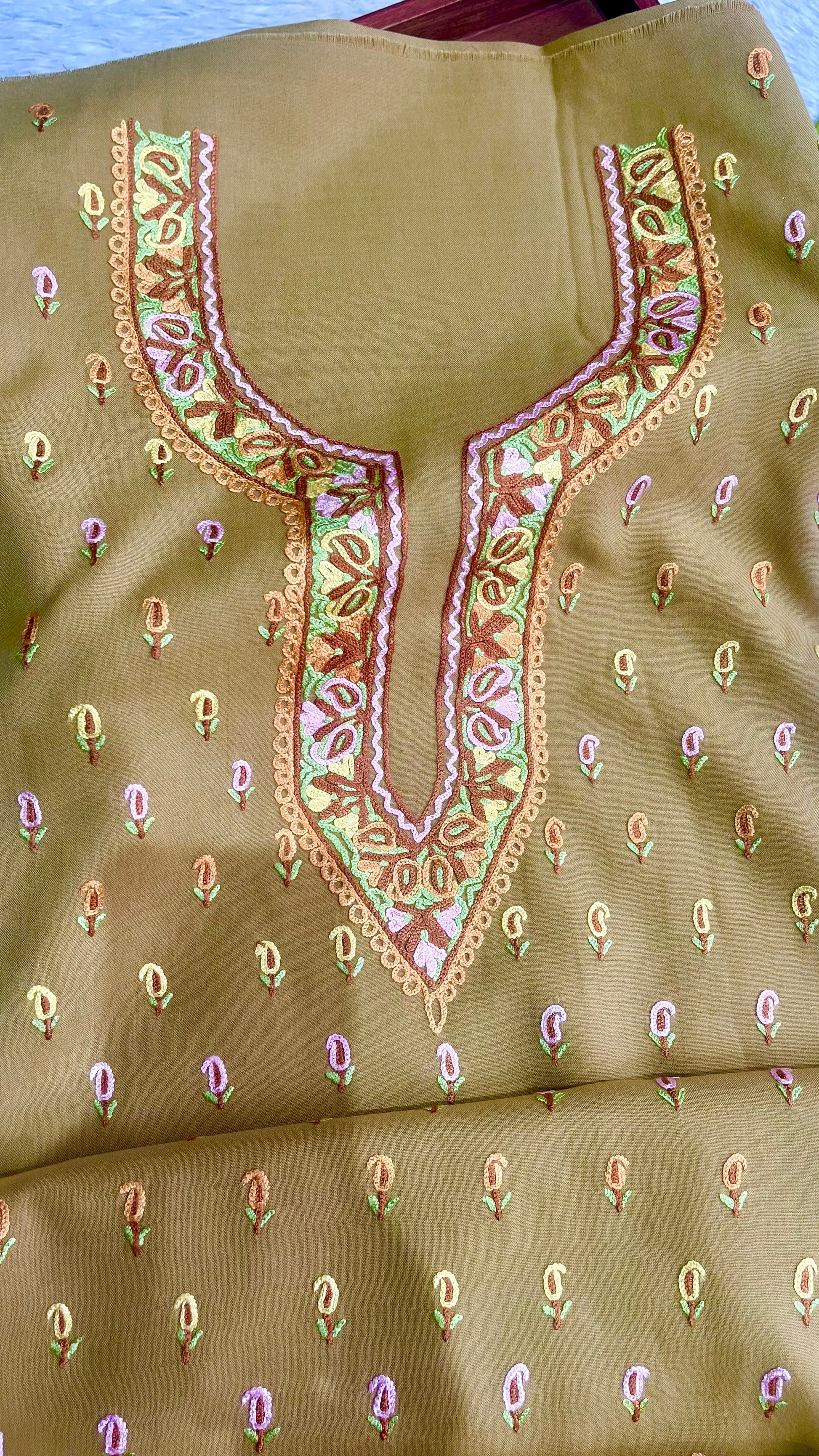 Olive Green with Multicolour Thread work Pure Cotton Kashmiri Aari Embroidered Co Ord 2 pc Set
