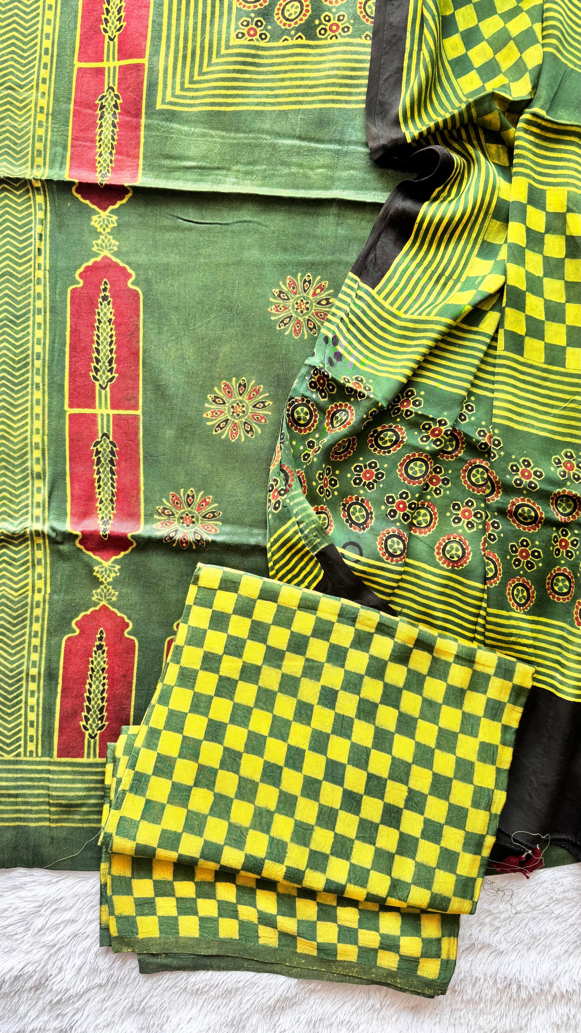 Green Minaar Motif Ajrakh Hand Block Print Mashru Silk 3 pc Suit Material with Modal Silk Dupatta
