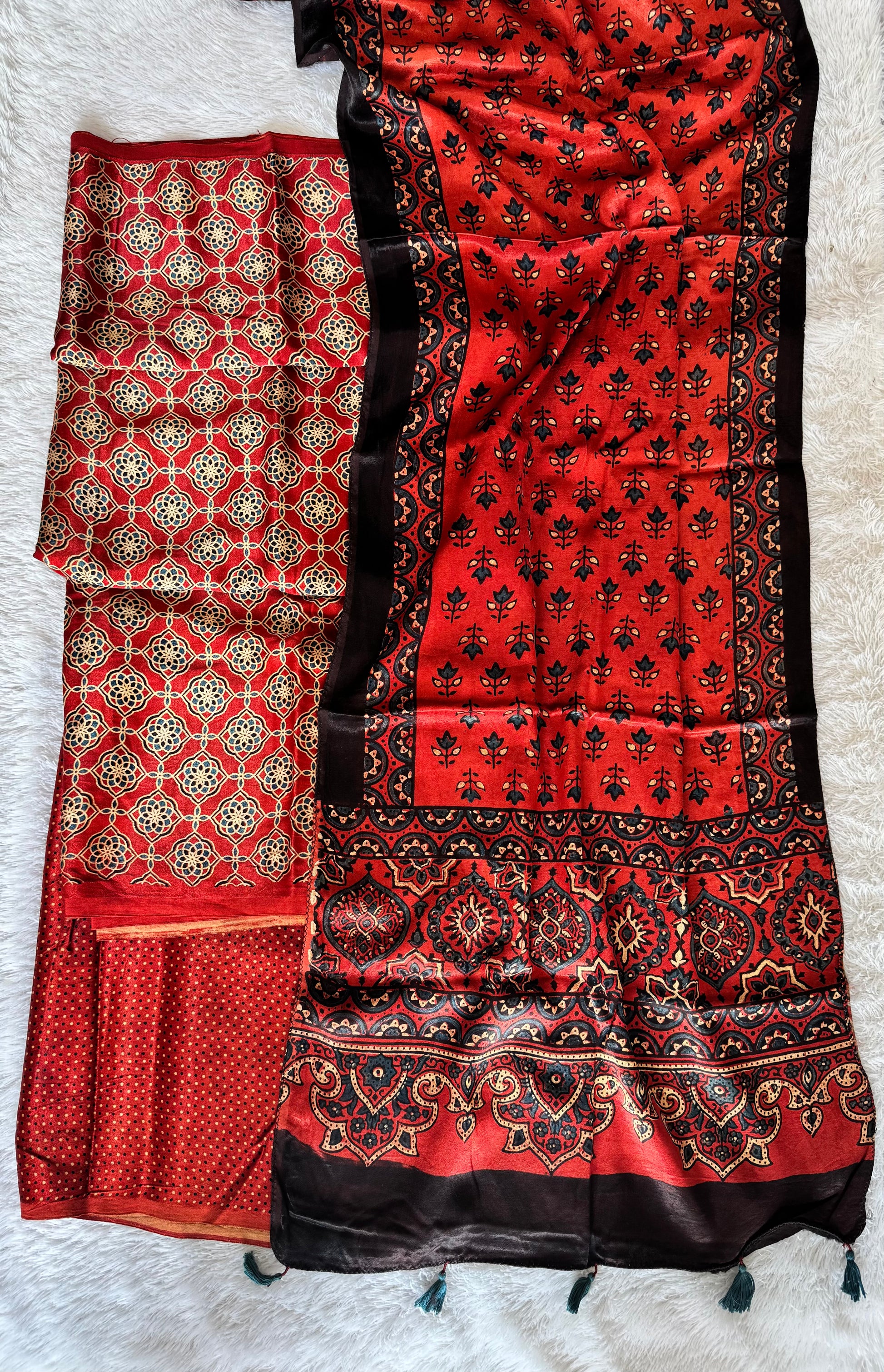 This Mashru 3 pc Suit Set dress material has fine quality hand block printed Jaal Boota with Ajrakh Mashru Tasseled Silk Stole. The earthy and eye pleasing silk suit set is very suitable for light daytime functions alongwith daily office wear. Mashru silks are known for its glossamer looks and amazing feel. Flaunt this suit set with minimal jewellery and heels for a semi formal look.