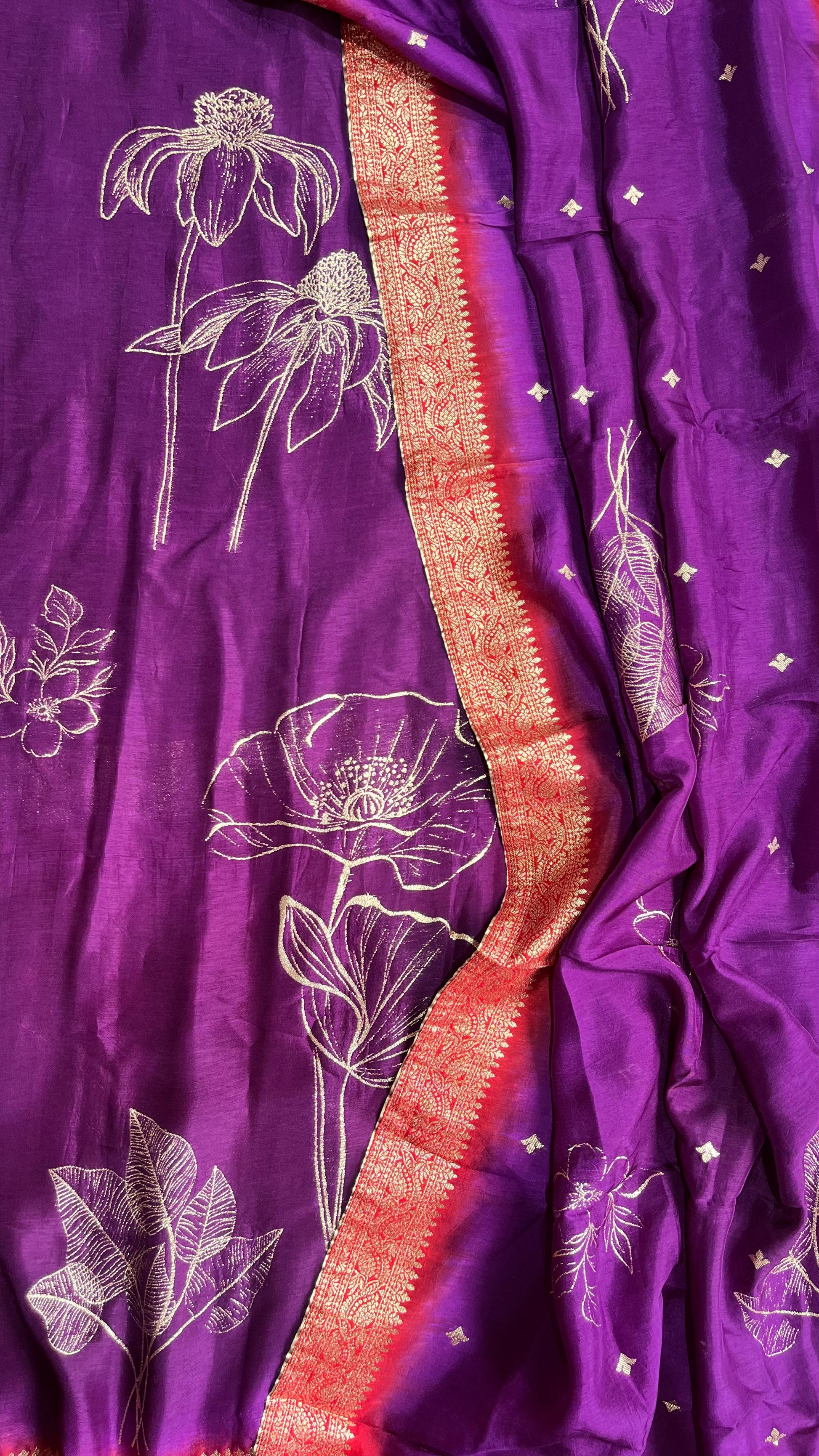Etheral Purple Dola Silk Hand Brush Print 2pc Suit Material Set with Zari Pallu and Full Finish with Tassels