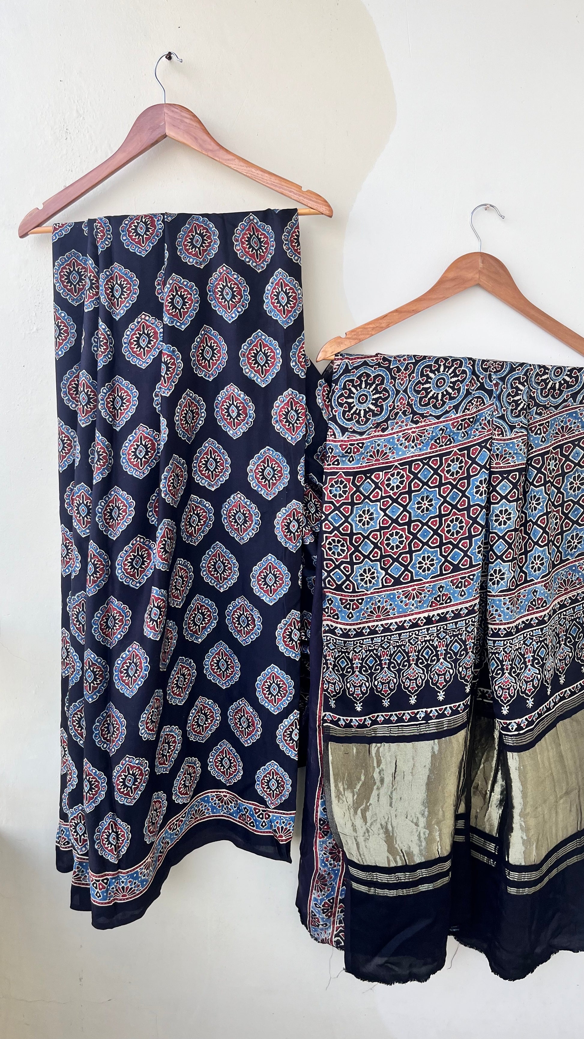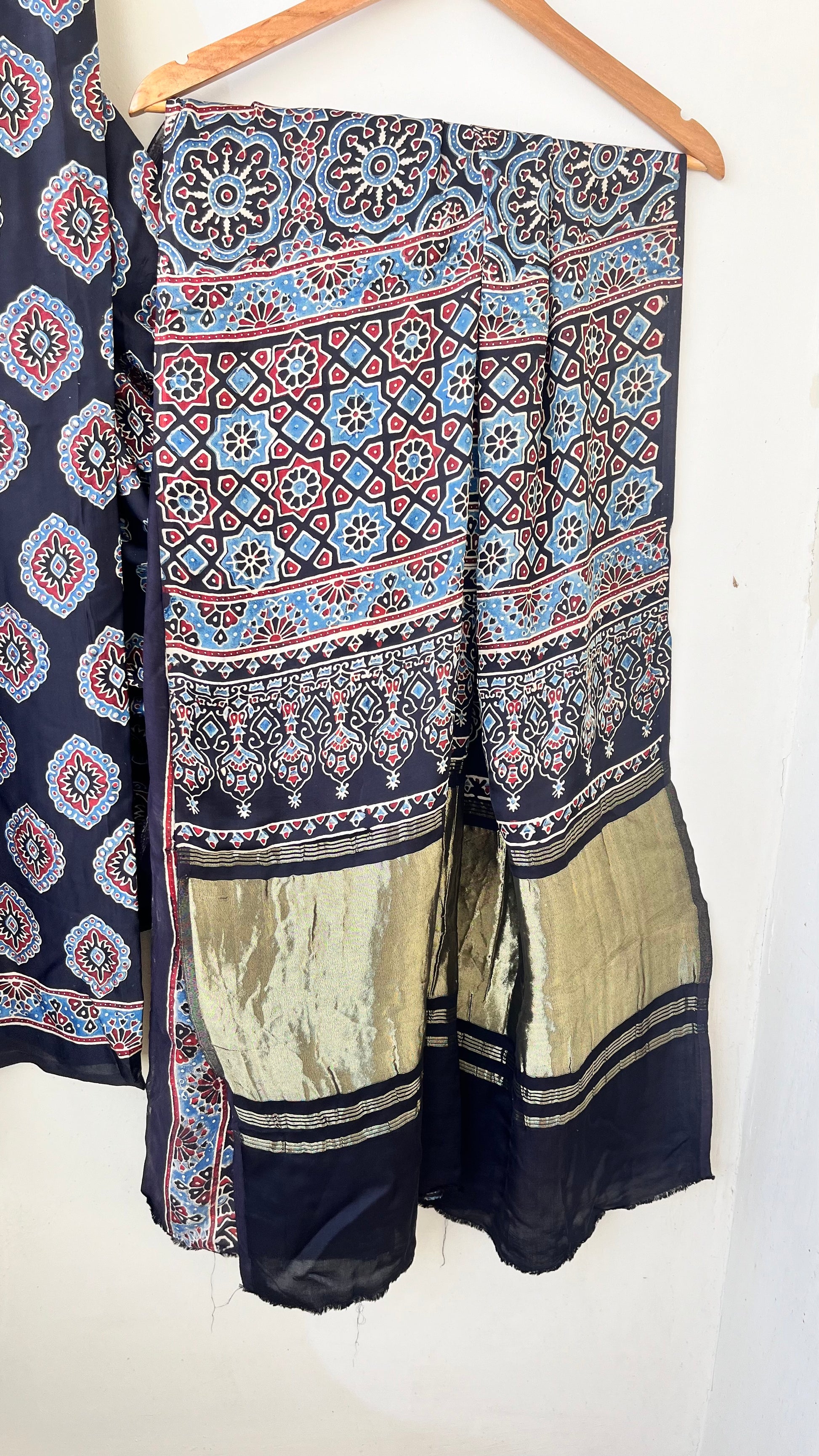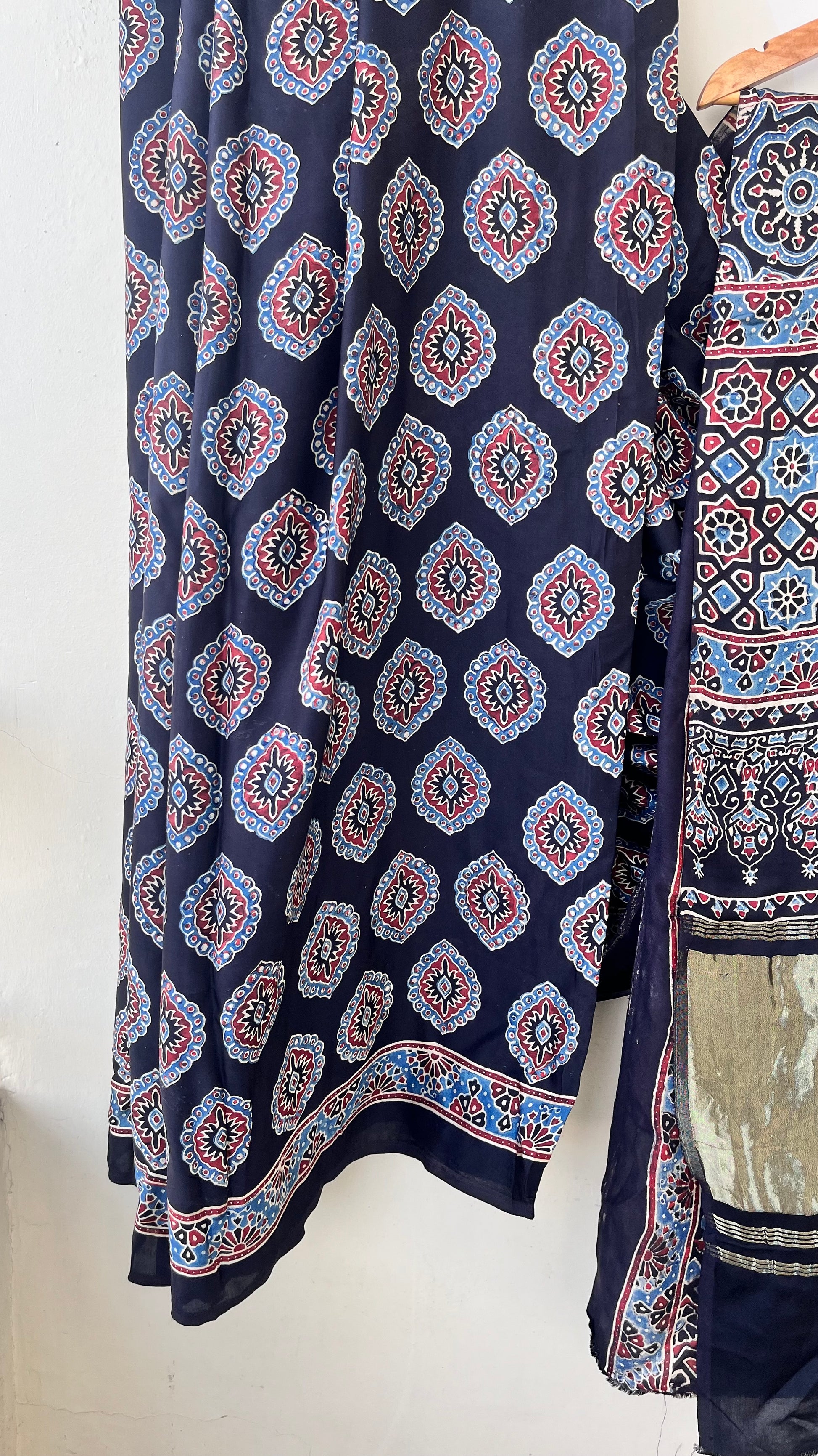 Our entrancing collection of authentic handcrafted Ajrakh modal silk sarees are an outcome of nature made with absolute love and patience. Handcrafted with vegetable dyes, the craft of Ajrakh hand-block printing is practised by the artisans in Kutch region of Gujarat. These eye pleasing modal silk ajrakh sarees immerse you with grace, poise and helps you stand out from the crowd. Each saree comes with a matching blouse piece. Thank you for looking and supporting handmade!