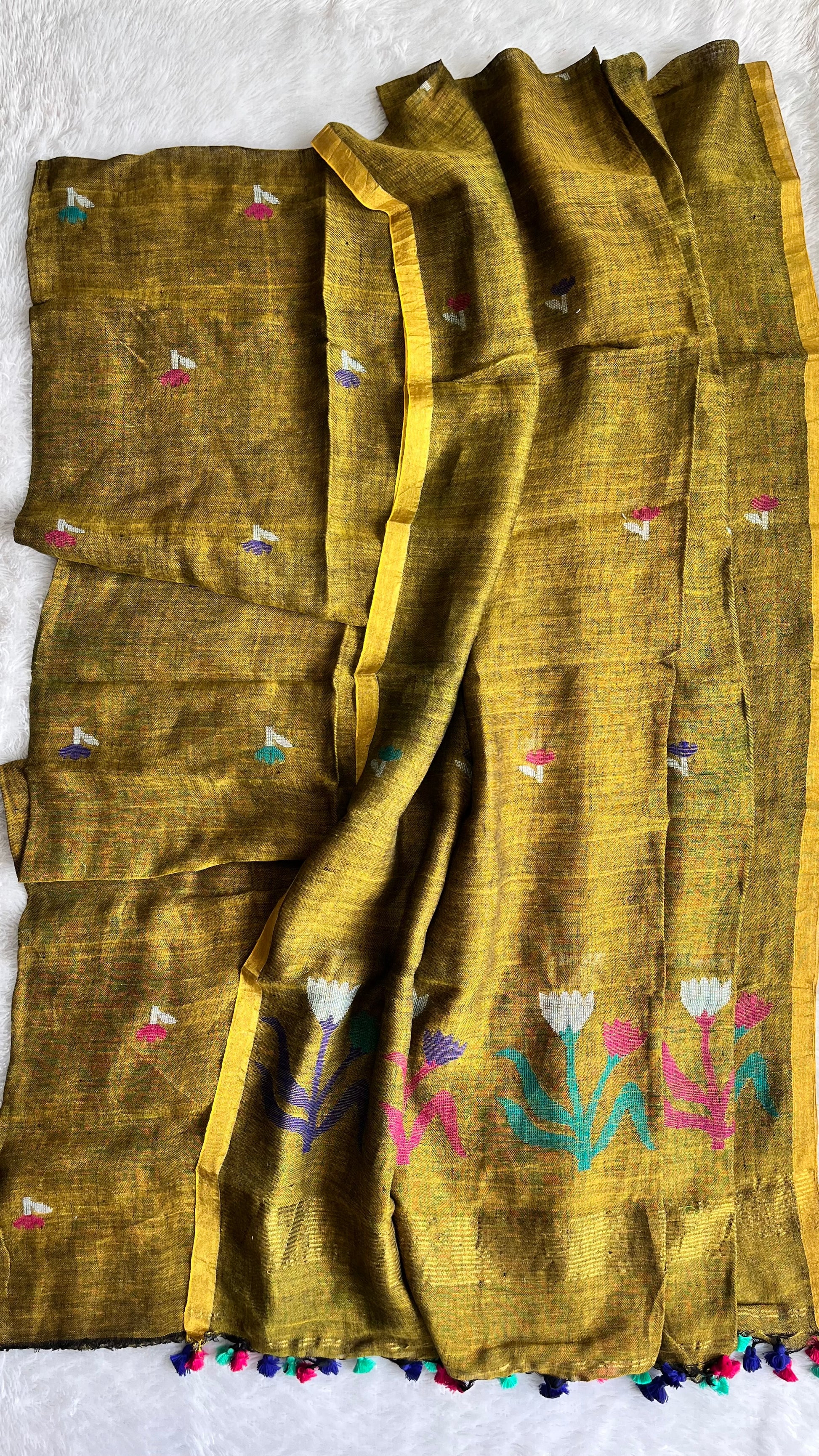 Mehendi Green Paithani Unstitched Pure Linen on Linen Hand Woven Daman 2 pc Suit Set