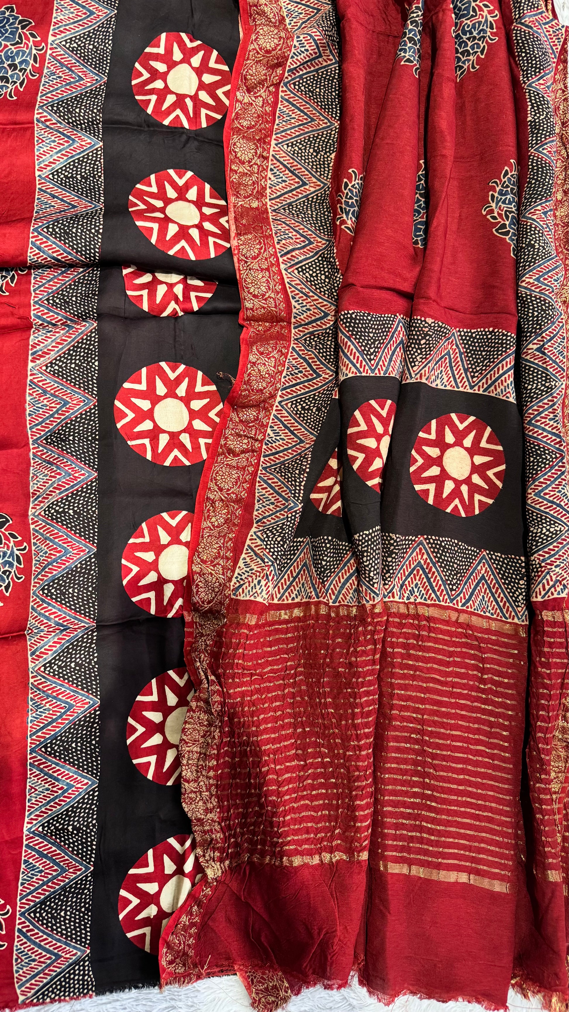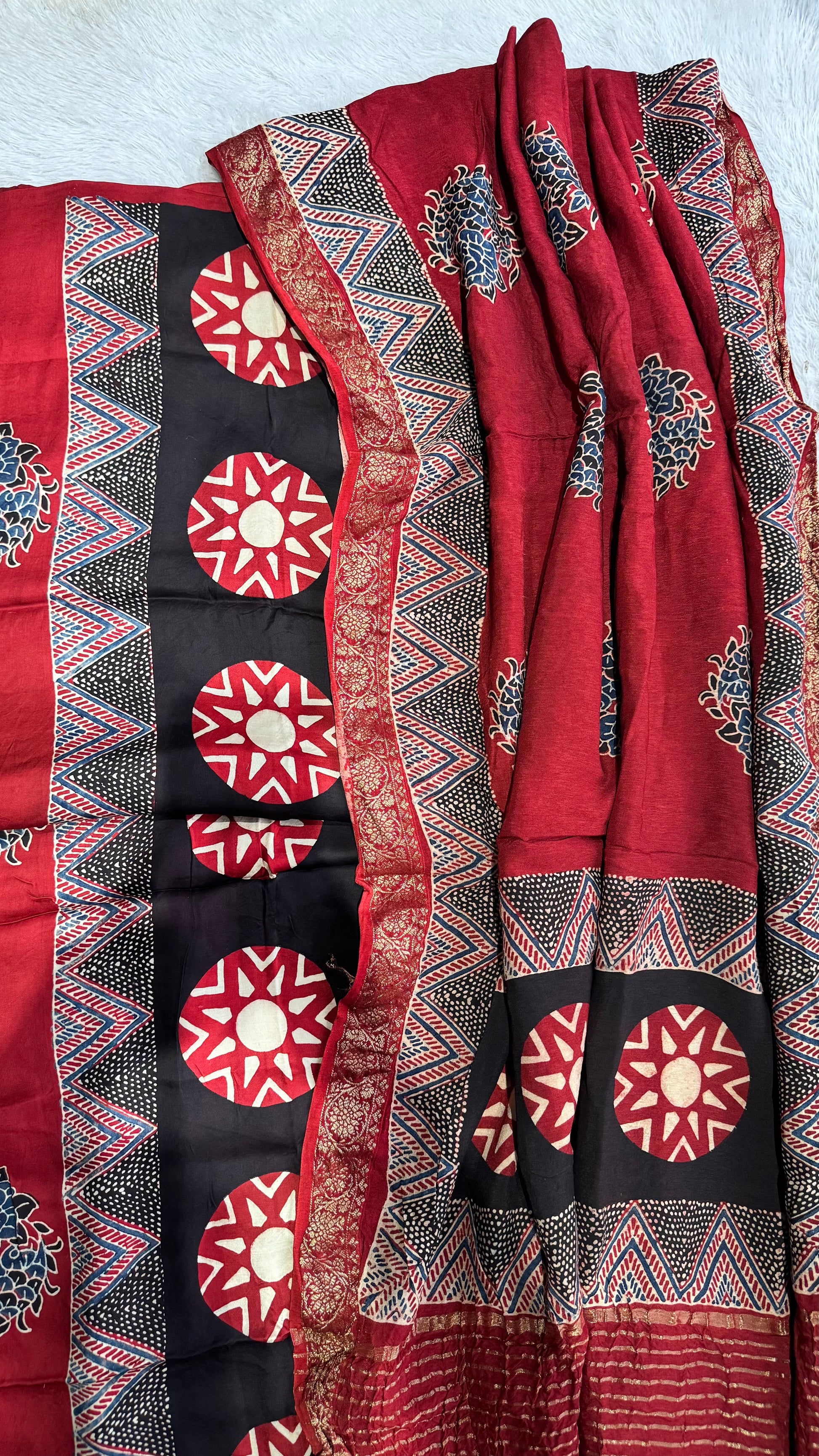 Maddar Red Star Motif Modal Silk Ajrakh Hand Block Print 2pc Suit Material Set with Dola Silk Dupatta
