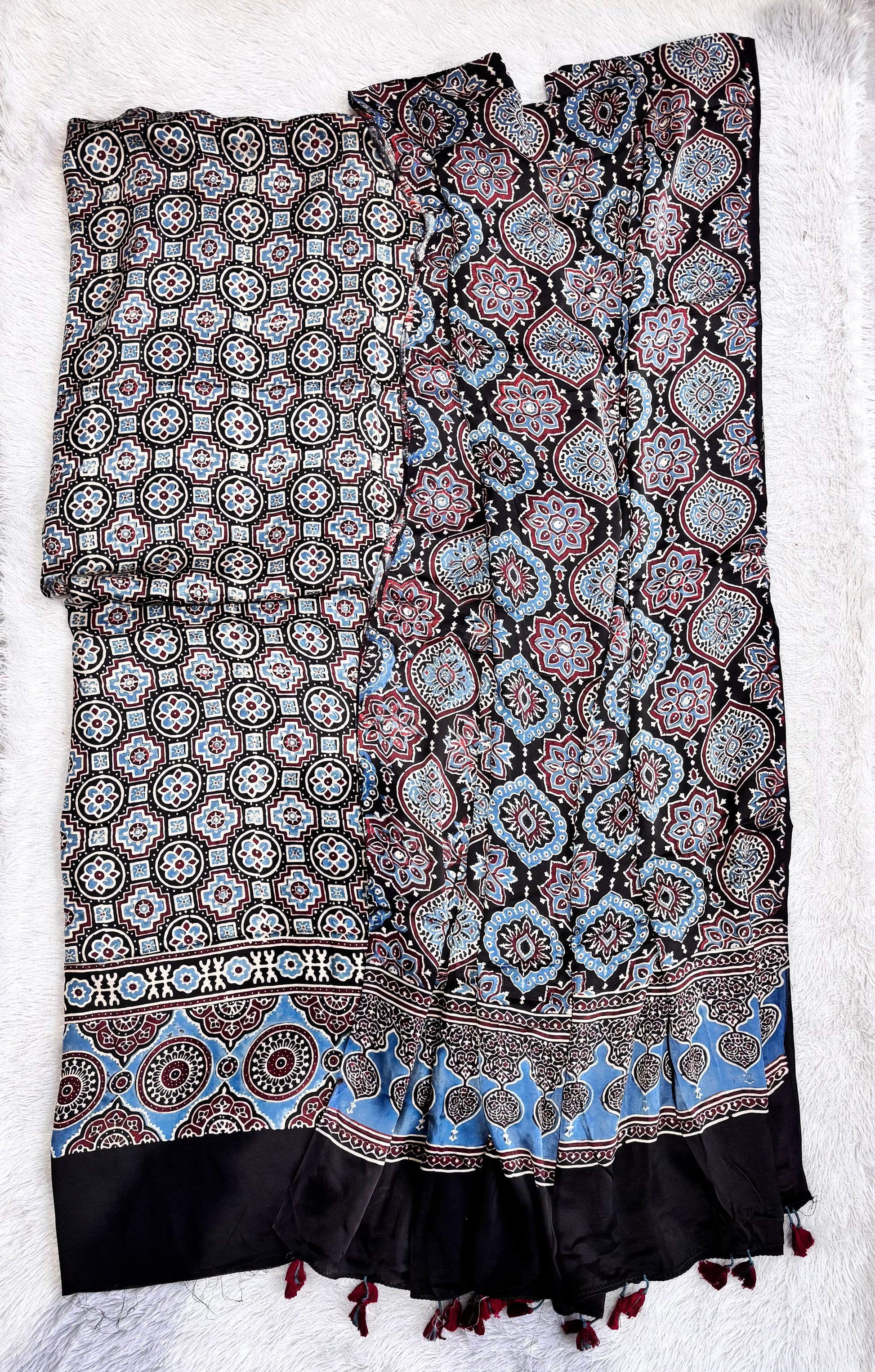 Our fine quality special vanaspati hand block printed modal silk dress material set is made using natural dyes through traditional technique of handblock printing. Modal silk is a soft, shiny and highly lustrous fabric, achieved through interlacing modal fibers and silk yarns. Ajrakh Modal Silk fabric has opulence of silk and the comfort of cotton making it a very fine and soft textured weave. Thank you for choosing handmade!