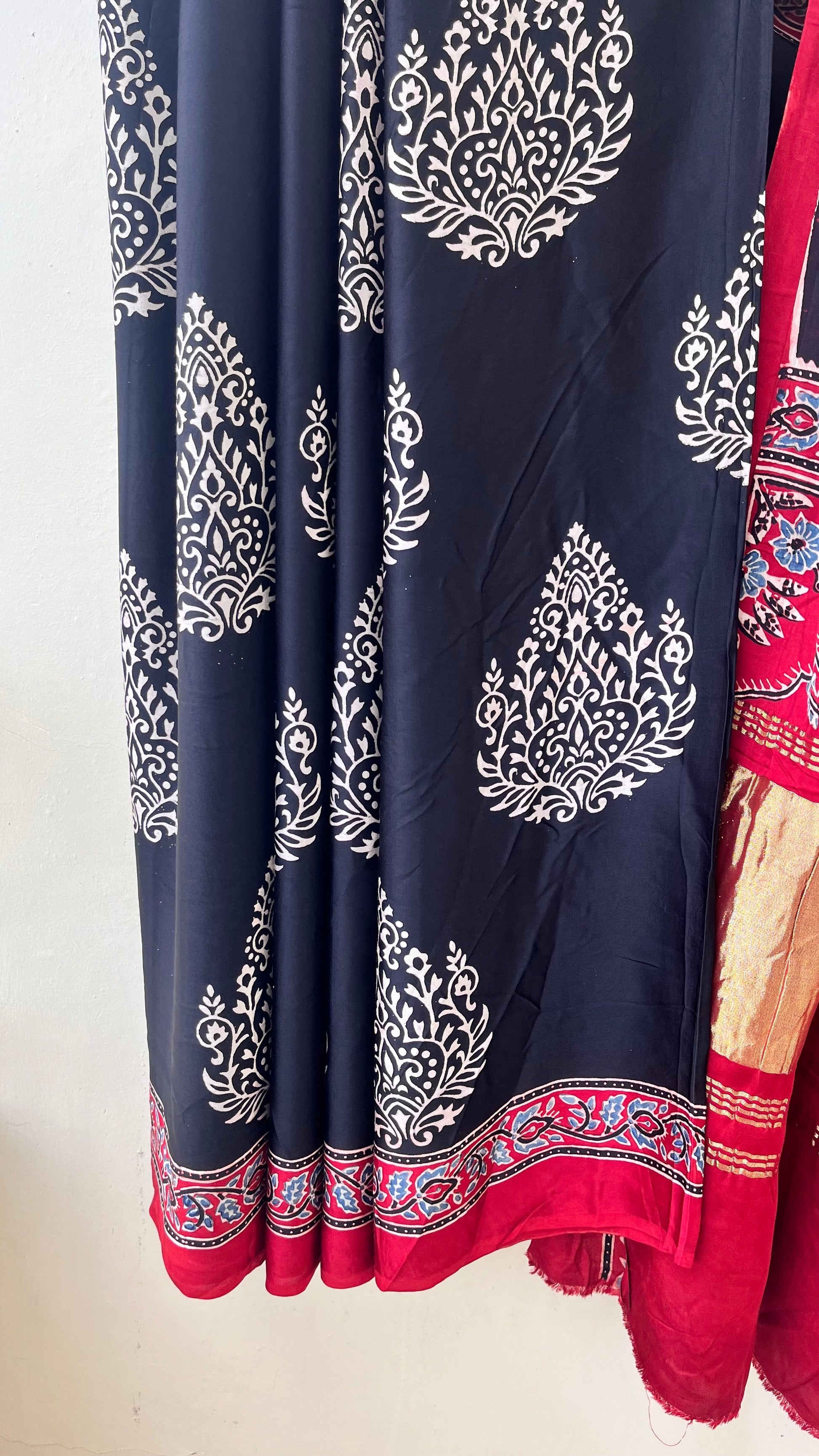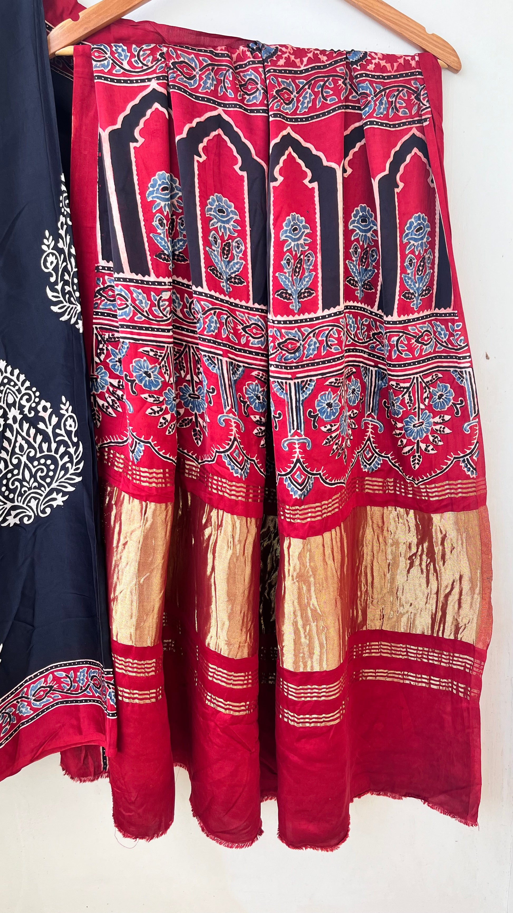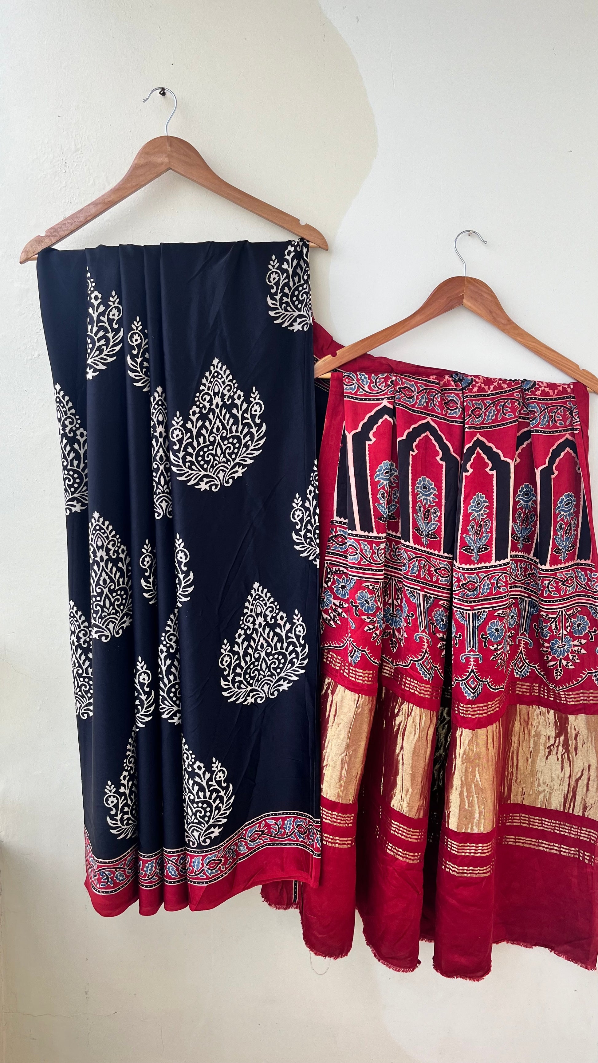 Black and Red Big Boota Ajrakh Hand Block Natural Dye Modal Silk Lagdi Patti Saree With Blouse