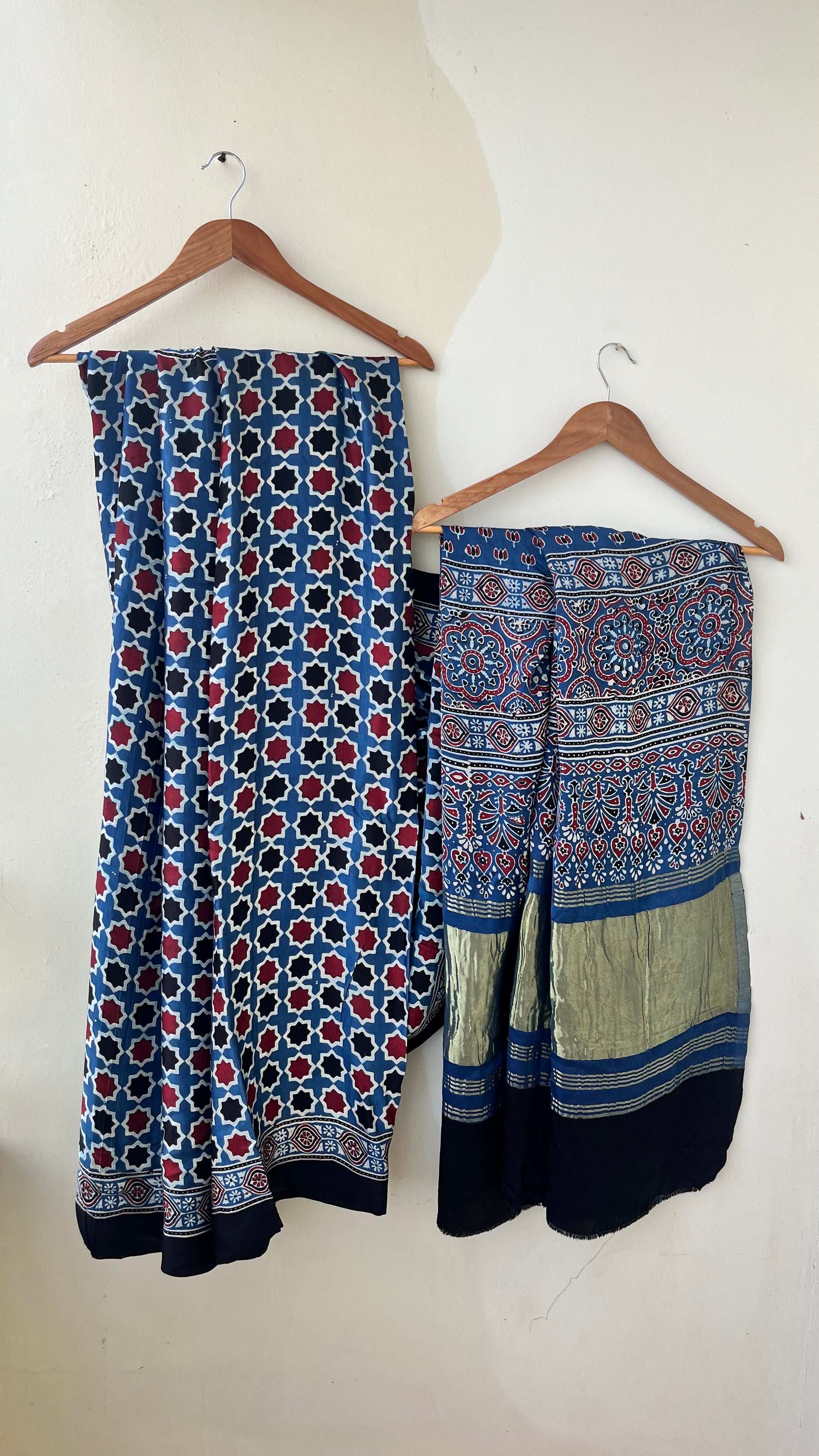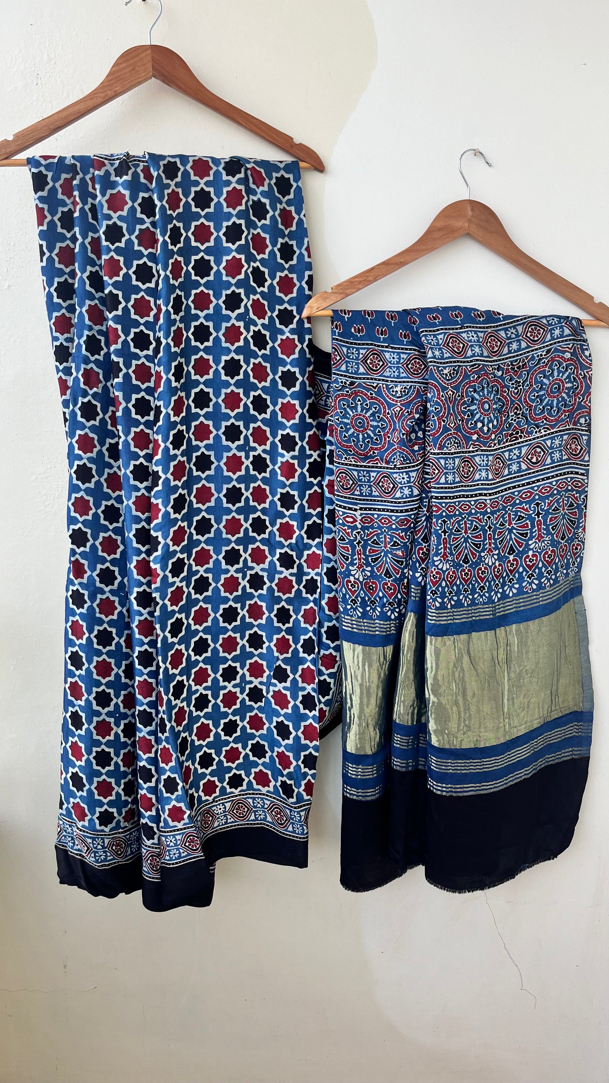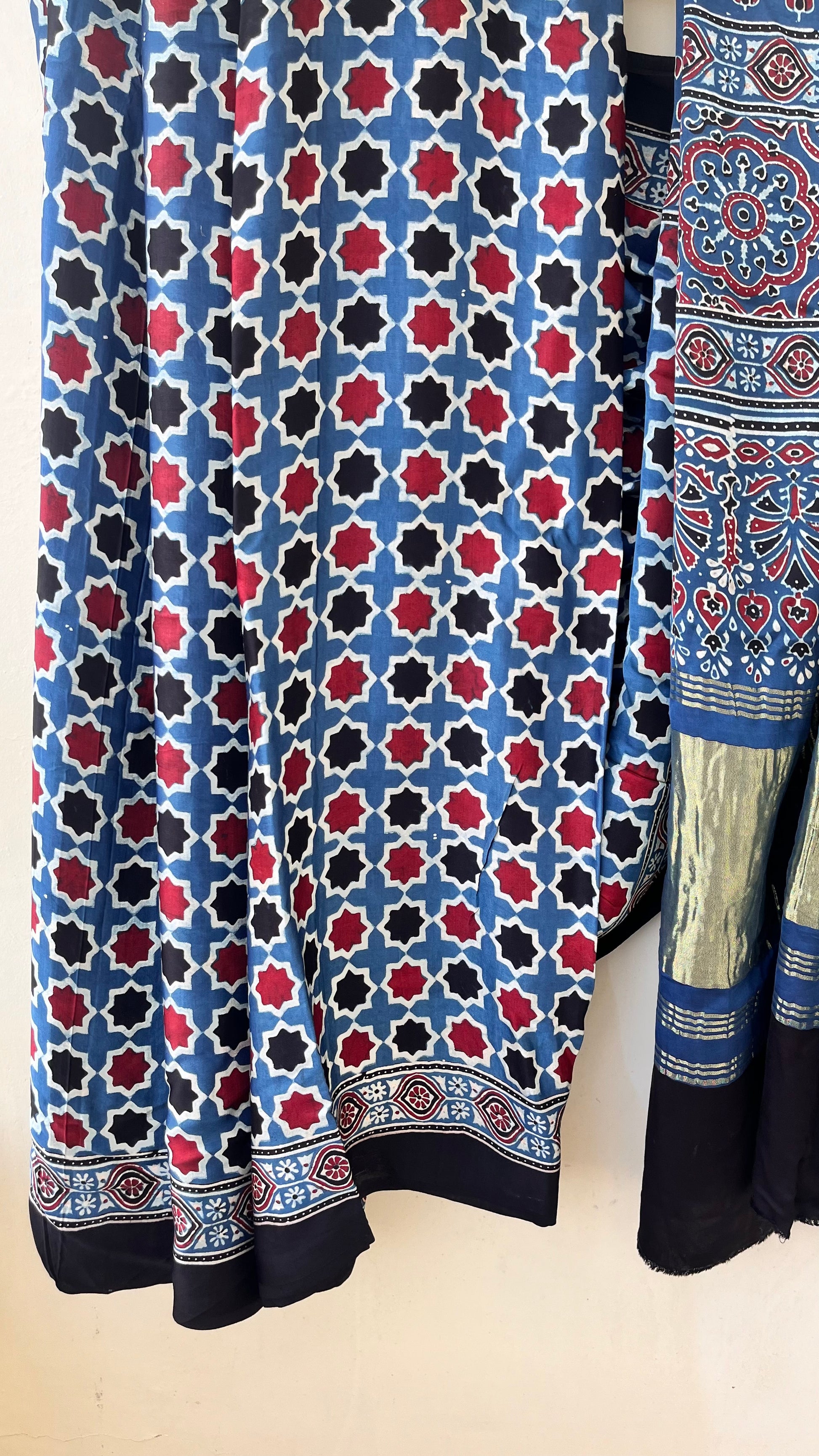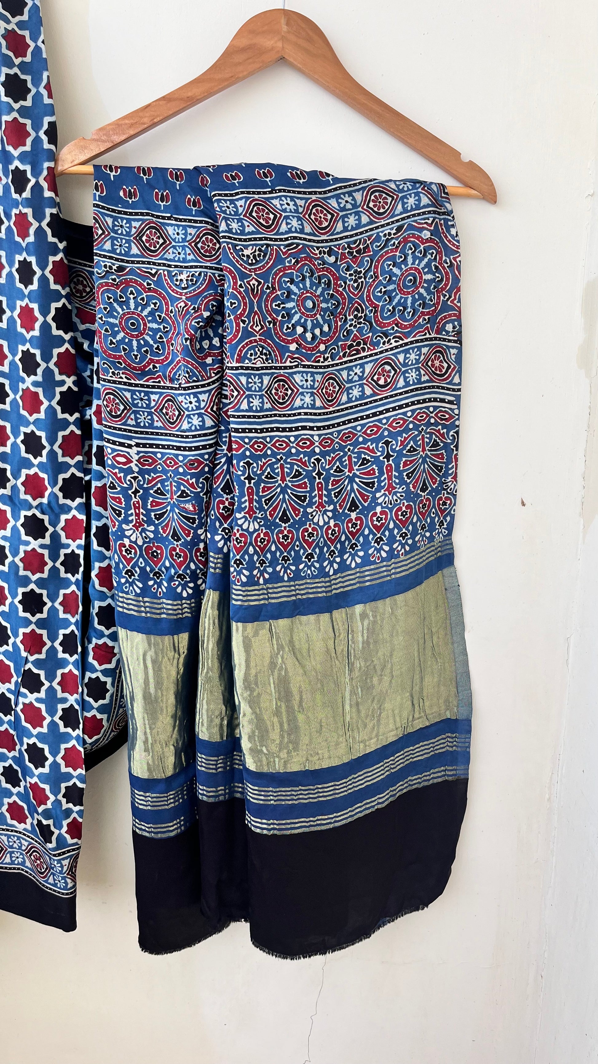 Our entrancing collection of authentic handcrafted Ajrakh modal silk sarees are an outcome of nature made with absolute love and patience. Handcrafted with vegetable dyes, the craft of Ajrakh hand-block printing is practised by the artisans in Kutch region of Gujarat. These eye pleasing modal silk ajrakh sarees immerse you with grace, poise and helps you stand out from the crowd. Each saree comes with a matching blouse piece. Thank you for looking and supporting handmade!