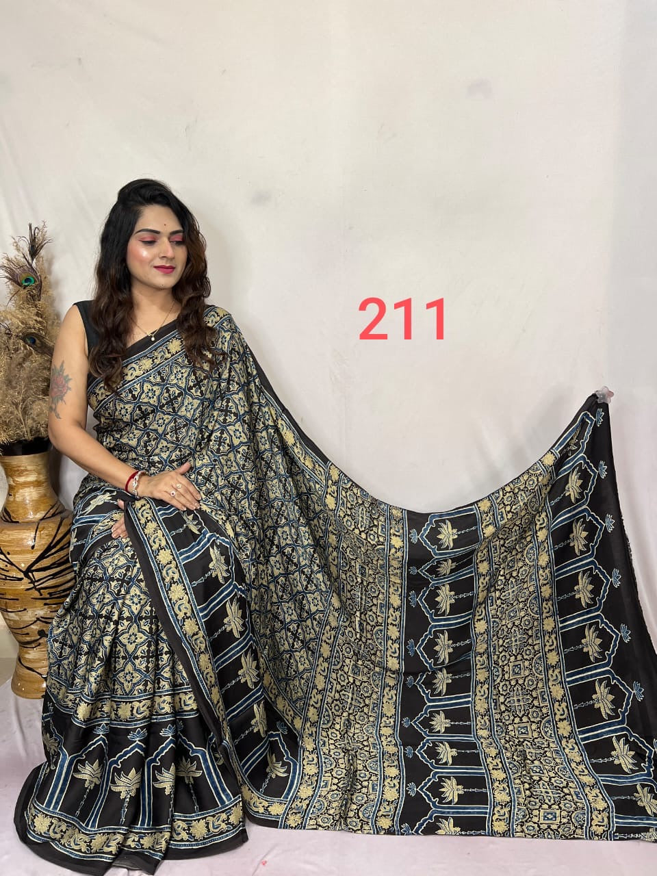 Our entrancing collection of authentic handcrafted Ajrakh modal silk sarees are an outcome of nature made with absolute love and patience. Handcrafted with vegetable dyes, the craft of Ajrakh hand-block printing is practised by the artisans in Kutch region of Gujarat. These eye pleasing modal silk ajrakh sarees immerse you with grace, poise and helps you stand out from the crowd. Each saree comes with a matching blouse piece. Thank you for looking and supporting handmade!